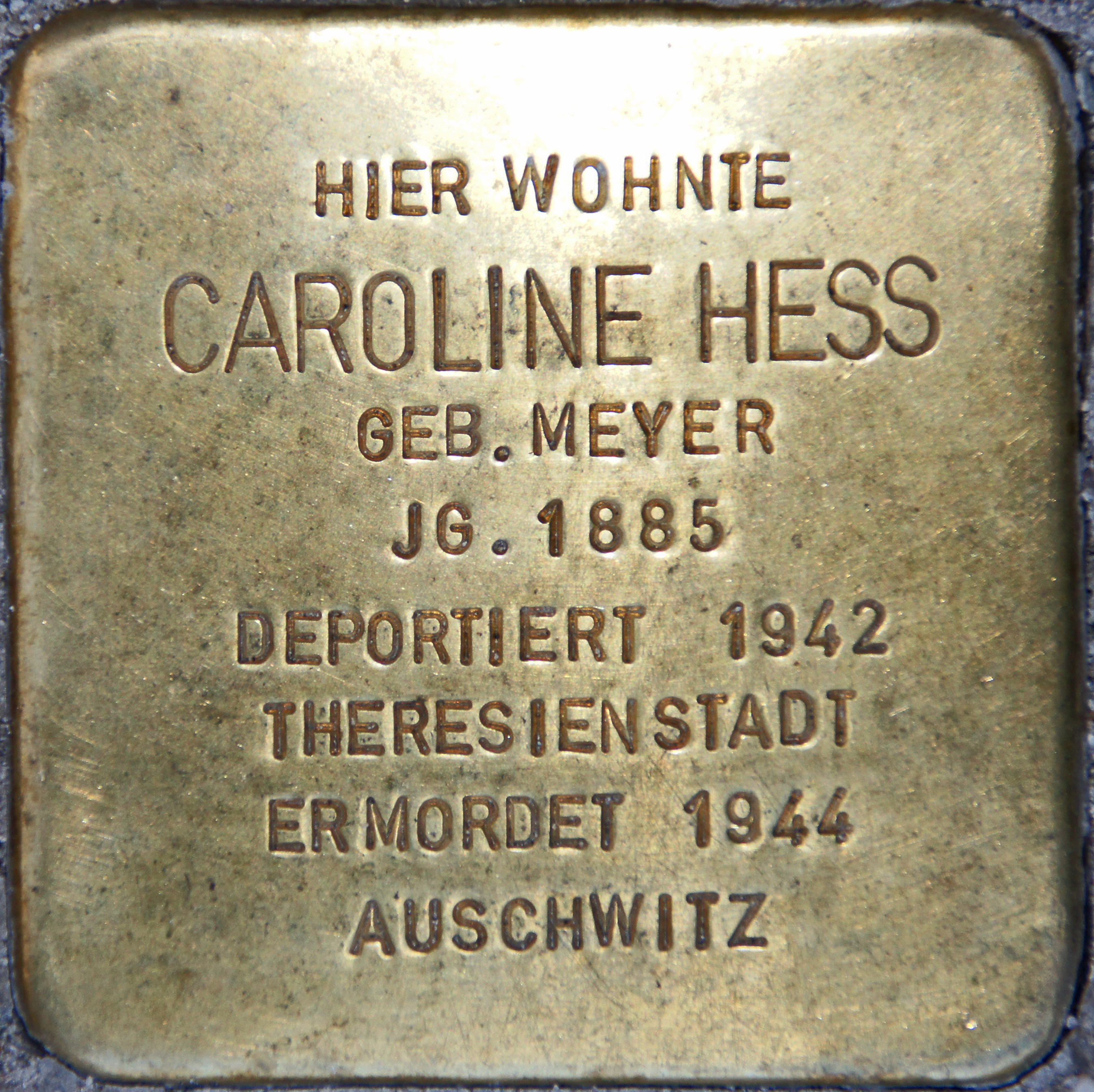 | Caroline Hess (genannt „Lina“) wurde am 10. September 1885 in Neunkirchen/Saar geboren. Sie war das zweite von drei Kindern von Liebermann Meyer (auch: Meier) (geboren 05.07.1853, gestorben 23.10.1930) und Johanna Meyer, geb. Moos (geboren 05.10.1845, gestorben 10.01.1915). Beide Eltern stammten aus Neunkirchen. Carolines Vater, Liebermann Meyer, war als Handelsmann tätig. Caroline hatte einen älteren Bruder, Adolf (geboren 23.05.1883), und einen jüngeren Bruder, Albert (geb. 31.07.1888). Über den weiteren Lebensweg der Brüder von Caroline war, von Eheschließungen abgesehen (Adolf: 19.11.1920; Albert: 14.11.1923) nichts in Erfahrung zu bringen. Es bleibt zu hoffen, dass sie mit ihren Familien rechtzeitig immigrieren konnten: Im Gedenkbuch des Bundesarchivs für die Opfer des Nationalsozialismus sind sie nicht verzeichnet. Im Haus der Familie in der Heizengasse Nr. 29 lebte zudem bis zu ihrem Tod die unverheiratete Schwester des Vaters, Rosa Meyer (geboren 22.12.1845, gestorben 01.04.1927).