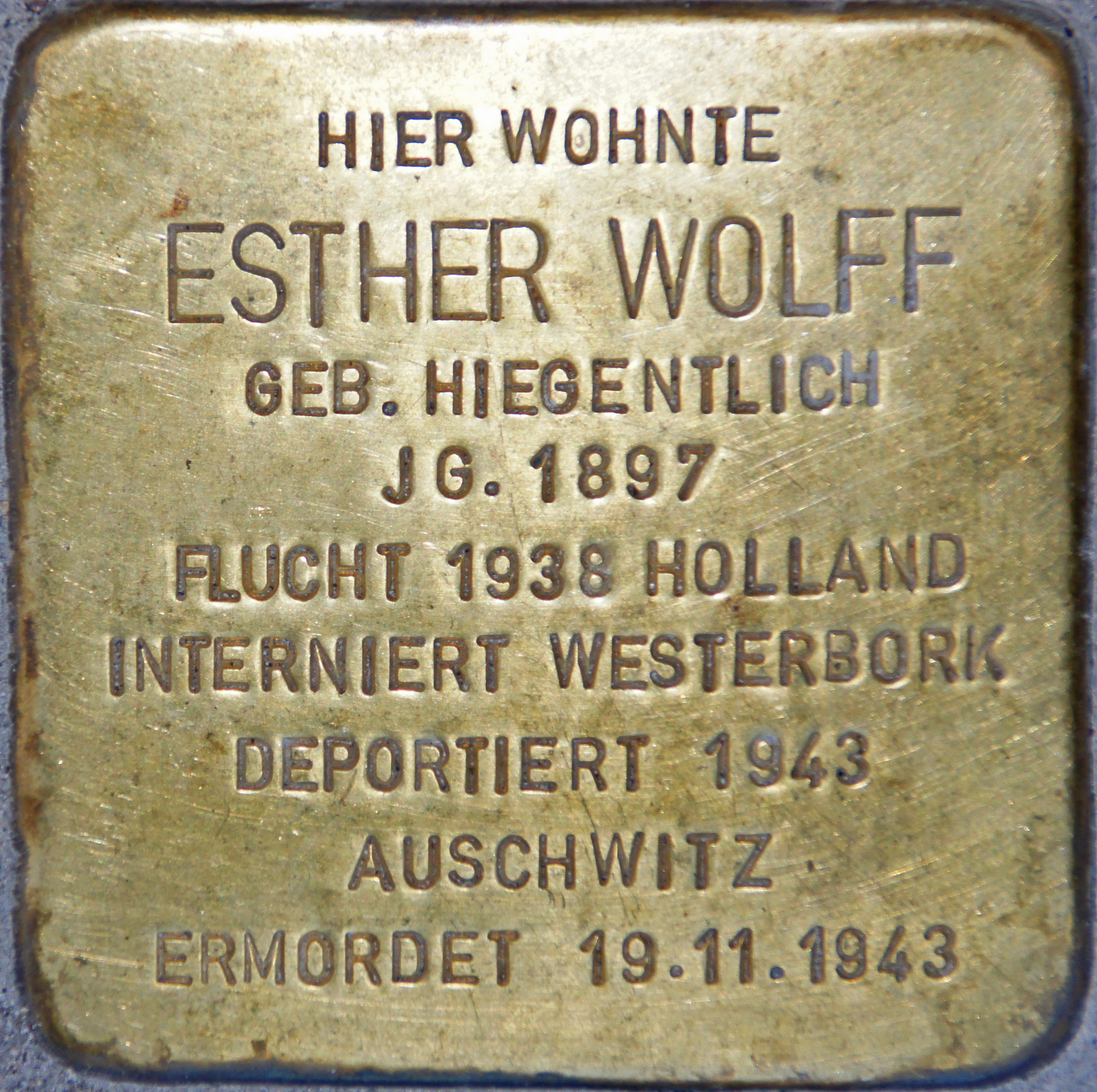 | Esther Wolff wurde am 17. Januar 1897 in Assen (NL) geboren. Am 28.05.1929 heiratet sie in Amsterdam den Auricher Viehhändler Leo Wolff (geboren am 17. Juni 1896, ermordet in Auschwitz am 19. November 1943). Das Paar zieht nach Aurich und hat dort vier Kinder: Wolff Leo Wolff (geboren am 11. Juli 1930, ermordet in Auschwitz am 19. November 1943), Aron (geboren am 5. Februar 1933, ermordet in Auschwitz am 19. November 1943) und die Zwillinge Louis und Hanni (geboren am 25. Oktober 1935). Louis verstarb nach 15 Monaten, seine Zwillingsschwester war schließlich die einzige Überlebende der Familie Leo Wolff. Am 31. Juli 1938 flieht Ester Wolff mit ihren drei Kindern vor der wachsenden Diskriminierung und Drangsalierung der jüdischen Bevölkerung von Aurich nach Amsterdam. Dort kommt sie bei der Familie ihrer Eltern, Familie Hiegentlich, in der Spiegelgracht 7 unter. Ihr Mann Leo Wolff kommt erst vier Wochen später, am 3.10.1938, nach Amsterdam.
