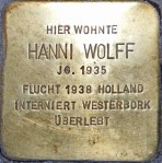 | Hanni Wolff wurde am 25. Oktober 1935 als viertes von vier Kindern von Ester Wolff, geb. Hiegentlich (geboren 17.01.1897, ermordet in Auschwitz 19.12.1943) und Leo Wolff (geboren 17.06.1896, ermordet in Auschwitz 2.01.1944) in Aurich geboren. Ihr Zwillingsbruder Louis verstarb im Alter von 15 Monaten am 27. März 1937. Noch vor ihrem 3. Geburtstag muss Hanni Wolff Aurich verlassen und flieht mit ihren Eltern und Geschwistern am 31.Juli 1938 von Aurich nach Amsterdam. Dort kommen die Wolffs bei der Familie Hiegentlich, der Familie ihrer Mutter, Ester Wolff, in der Spiegelgracht 7 unter. Am 26. September 1943 werden ihre Eltern und ihre Brüder zunächst in Westerbork interniert, am 16. Oktober 1943 nach Auschwitz deportiert und dort ermordet. Die zu diesem Zeitpunkt 8-jährige Tochter Hanni Wolff überlebt den Völkermord. Sie hielt sich in der Kriegszeit bei Familie Durk Wiersma in Brantgum (etwa 5km nördlich von Dokkum) auf. Im Mai 1945 meldet der Dokkumer Schuhverkäufer Wabe van Dijk an die POD (Politieke Opsponseringsdienst), dass Hanni überlebt habe und wieder mit ihrer Familie vereint werden könnte – aber es gab keine Familie mehr.Nach Kriegsende stellt der Vormund für die Enkeltochter von Rahel Rosa Wolff, Hanni Wolff, der einzigen Überlebenden der Familie, Anträge auf Entschädigung für 3 verschiedene Grundstücke und 2 Häuser, darunter auch für das Grundstück Julianenburger Straße 3, das von Deutschen Reich konfisziert worden war. Hanni Wolff wandert nach Israel aus, es gelingt ihr aber nicht dort Fuß zu fassen. Sie leidet unter Depressionen und kehrt nach Holland zurück. Die Auseinandersetzungen um die Rückerstattung von Familieneigentum wirken auf sie zermürbend. Hanni Wolff lebte später in Amsterdam und Amersfoort. Nachtrag: Lt. geni.com ist Hanni Wolff am 29.01.2016 im Alter von 80. Jahren in Amsterdam gestorben und wurde in Muiderberg beerdigt. |