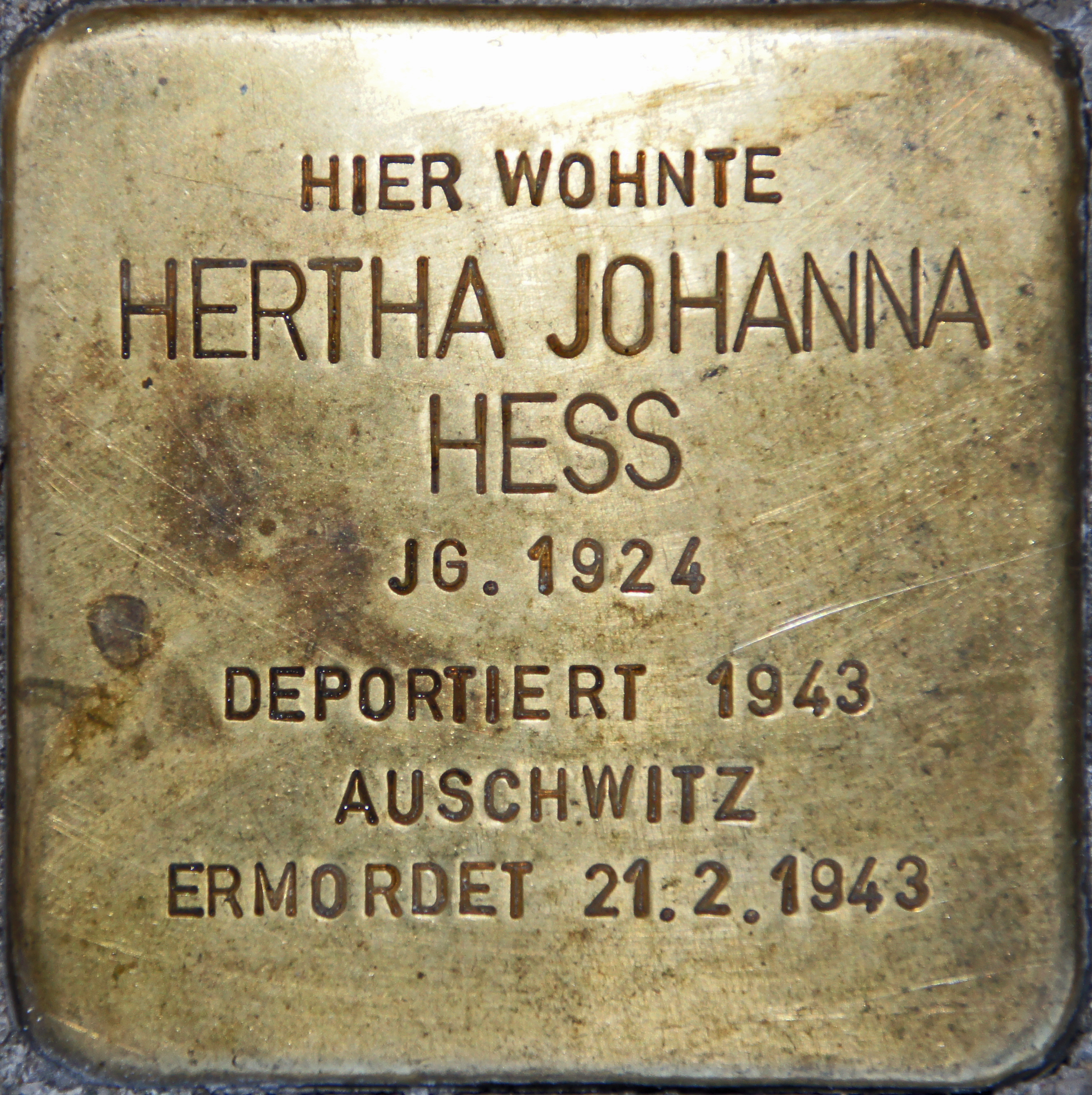 | Hertha Johanna Hess wurde am 01. Januar 1924 in Bunde geboren. Sie war das erste Kind von David Hess (geboren 06.10.1876, ermordet 23.07.1943) und Caroline Hess, geb. Meyer (geboren 10.09.1885 in Neunkirchen/Saar, ermordet 1944). Ihr Bruder Max kam fast genau fünf Jahre nach ihr auf die Welt, am 09. Januar 1929. Die Familie lebt zunächst in Bunde, wo sich einst der aus Papenburg stammende Großvater Hertha Johannas, Moses Jacob Hess, niedergelassen hatte. David, der Vater von Hertha Johanna, ist von Beruf Schlachter bzw. Viehhändler. Infolge von Boykottaktionen und Repressalien wird die Lage vieler Familien in Bunde nach 1933 immer schwieriger, so dass bereits in jenem Jahr viele jüdische Familien den Ort verlassen. Im Juni 1934 zieht auch Herta Johannas Familie aus Bunde fort und meldet sich am 25. Juni 1934 in Aurich an. Hertha Johanna bewohnt mit ihren Eltern und ihrem Bruder zunächst das Haus in der Wallstraße 56. David Hess scheint in Aurich zumindest zunächst eine Anstellung als Schlachter bzw. Viehhändler zu haben. Ein weiterer Grund für dem Umzug nach Aurich mag darin bestehen, dass ein Bruder und eine Schwester von Hertha Johannas Vater in Aurich leben: Der Kaufmann Joseph Hess und Friederike Lachmann, geborene Hess. Die Zeit in Aurich ist geprägt von häufigen Wohnsitzwechseln, die nicht zuletzt ein Spiegel der schwierigen Situation der Familie sind. Rund ein Jahr nach ihrer Ankunft in Aurich zieht die Familie um in die Von-Jhering-Str. 27, dann weiter in die Wallstraße 2 und schließlich in die Julianenburger Straße 3. Hertha Johanna lebt jedoch auch nicht lange an dieser letzten Adresse der Familie in Aurich. Am 14. Juli 1939, sieben Monate nach dem Einzug der Familie in jenes Haus, verlässt Hertha Johanna die Stadt. Sie zieht nach Hannover in die Brabeckstr. 86, wo die jüdische Minna-James-Heineman-Stiftung ansässig ist und ein „Altenheim für Damen“ unterhält. Da Hertha Johanna erst 15 Jahre alt ist, ist davon auszugehen, dass in dem Haus eine Verwandte der Familie lebt oder arbeitet, bei der Hertha Johanna untergebracht wird, um die Familie in Aurich zu entlasten. Hertha Johanna wohnt über ein Jahr lang in dem Altenheim und zieht erst am 27. November 1941 erneut um: Sie meldet sich nach Berlin ab, von wo aus sie später auch deportiert wird. Leider lässt sich ihre neue Adresse in Berlin nicht feststellen. Vermutlich kehrt sie jedoch zu ihren Eltern zurück, die nun in Berlin in der Rosenstraße 2-4 wohnen. Spätestens zu Beginn des Jahres 1942 zieht auch Hertha Johannas kleiner Bruder Max nach Berlin: Er war zwischenzeitlich in einem Kinderheim in Hildesheim untergebracht worden. Bis zum August 1942 war die Familie wohl wieder vereint. Am 21. August 1942 werden jedoch Caroline, David und Max Hess nach Theresienstadt deportiert. Hertha Johanna bleibt allein in Berlin zurück. Es bleibt unklar, wie viel der Rest der Familie über das Schicksal der Tochter und Schwester erfährt: Hertha Johanna bleibt noch rund fünf Monate in Berlin, wo sie möglicherweise als Zwangsarbeiterin eingesetzt wird. Am 03. Februar 1943 wird sie nach Auschwitz deportiert. Hier lebt sie noch rund drei Wochen. Am 21. Februar 1943 wird Hertha Johanna in Auschwitz ermordet. In den Totenbüchern des Vernichtungslagers ist ihr Name unter der Nummer 9425/1943 zu finden. Auch die übrigen Familienmitglieder werden von den Nationalsozialisten ermordet: David Hess wird am 23. Juli 1943 ein Opfer der unmenschlichen Bedingungen im Ghetto Theresienstadt. Caroline und Max Hess werden am 16. Mai 1944 wie Hertha Johanna nach Auschwitz deportiert, doch ihre Namen finden sich nicht in den Registern. Sie sterben möglicherweise direkt nach ihrer Ankunft in Auschwitz-Birkenau am 17. Mai 1944.