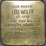 Am 31. Juli 1938 flieht seine Frau Esther mit den drei Kindern vor der wachsenden Diskriminierung und Drangsalierung der jüdischen Bevölkerung von Aurich nach Amsterdam. Dort kommen die Wolffs bei der Familie Hiegentlich, der Familie von Esthers Eltern, in der Spiegelgracht 7 unter. Leo Wolff kommt erst vier Wochen später, am 3.10.1938, nach Amsterdam, vermutlich, da noch einige Angelegenheiten in Aurich regeln muss. Die Familie zieht 1939 in die Weteringschanz 231 in Amsterdam. Aus den Unterlagen des Jüdischen Rates (der Niederlande) erfahren wir, dass Leo Wolff von Nierensteine geplagt wird und dass er als Kaufmann (bzw. Metallkaufmann) seinen Lebensunterhalt sucht. Seine Frau Ester ist unter der Adresse als Zahnarztassistentin gemeldet. Von Anfang Mai 1942 an müssen Juden auch in den Niederlanden den gelben Stern mit dem Wort „Jood“ tragen. Im Sommer 1942 schließlich beginnen die Deportationen; bereits 1943 gelten die Niederlande praktisch als „judenrein“. Über das „polizeiliche Durchgangslager“ Westerbork nahe der deutschen Grenze rollen die Züge in die Vernichtungslager. In den Niederlanden selbst sterben vergleichsweise wenig Juden, ihre Ermordung findet in Deutschland und Osteuropa statt. Am 26. September 1943 wird auch Leo Wolff mit seiner Frau und den beiden Söhnen zunächst in Westerbork interniert und am 16. Oktober 1943 nach Auschwitz deportiert. Frau und Kinder werden kurz nach der Ankunft in Auschwitz am 19. November 1943 ermordet. Die zu diesem Zeitpunkt 8-jährige Tochter Hanni Wolff überlebt den Völkermord. Sie hielt sich in der Kriegszeit bei Familie Durk Wiersma in Brantgum (etwa 5km nördlich von Dokkum) auf. Im Mai 1945 meldet der Dokkumer Schuhverkäufer Wabe van Dijk an die POD (Politieke Opsponseringsdienst), dass Hanni überlebt habe und wieder mit ihrer Familie vereint werden könnte – aber es gab keine Familie mehr (s. Biografie Hanni Wolff). |