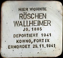 Die Geschwister warten in Aurich in einer Zwischenherberge auf die Papiere für die Auswanderung nach Amerika. Aber nur Levy mit Familie gelingt die Ausreise über Antwerpen nach New York. Rosa, ihre Schwester Karoline und die Brüder Simon und Wilhelm müssen am 29.02.1940 im Zuge der angeordneten Judenräumung des Grenzgebietes Aurich verlassen. Sie kommen an verschiedenen Wohnplätzen in Berlin unter, welche ihnen die jüdische Sozialverwaltung zuweist. Zuletzt in der Hohenstaufenstraße 8 und der Augsburger Straße 21. Am 17.11.1941, es ist der allererste Transport von Berlin, wird Rosa zusammen mit ihren Geschwistern nach Kowno (Kauen) in Litauen deportiert. Der Transport umfasst 1.006 Personen, von denen fast keiner überlebt. Nach Ankunft werden alle Geschwister am 25.11.1941 an offene Gruben beim Fort IX geführt und dort erschossen. Zu erwähnen ist noch das Schicksal ihrer Schwester, Hannchen Wolffs. Sie wohnt zuletzt im Haus Nr. 7 hier gegenüber. Sie wird am 28.10.1942 nach Theresienstadt deportiert, am 28.10.1944 nach Auschwitz und wird dort bei Ankunft ermordet. |