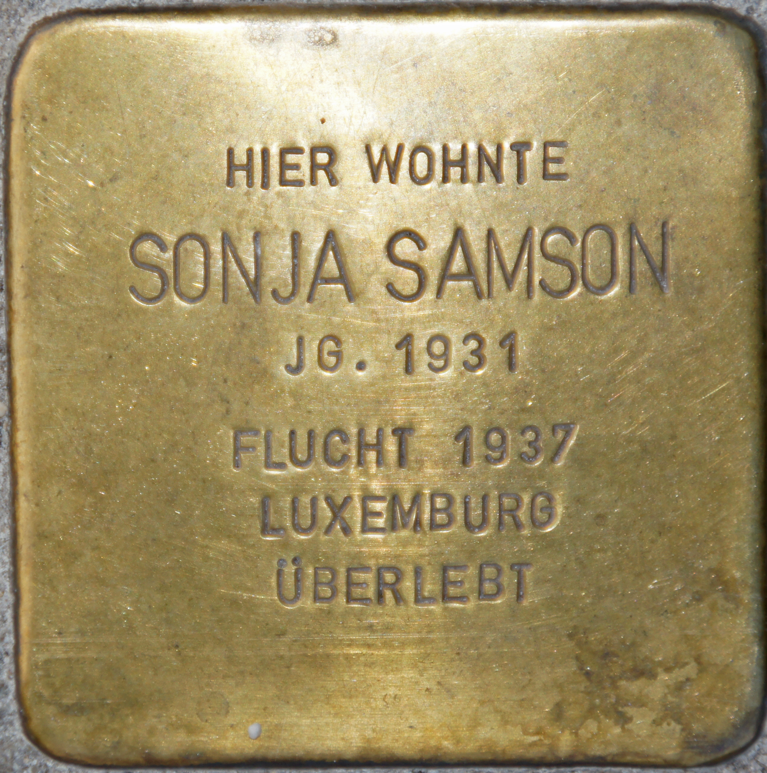 | Sonja Samson wurde am 30.Januar 1931 in Aurich geboren. Sie ist das einzige Kind der Familie Josef Ruben Samson und Carla geborene Hoffmann. Sie wird in Aurich nur Sonie gerufen, Sonja nur, wenn sie von den Eltern ausgeschimpft wird.Ihr Vater ist Viehhändler, dessen Vater Ruben Josef und dessen drei weitere Brüder sind ebenfalls Viehhändler. Ihre Mutter stammt aus Dillingen, Saargebiet, wo das Paar am 13.04.1928 heiratet. Sie ziehen am 3.06.1928 in das Haus am Neuen Hafen 2. Carlas Eltern – Adolf Hoffmann und Hildegard geborene Löw – hatten es für das junge Paar gekauft. Dieses Haus wird übrigens im Zuge der Zwangsarisierung nicht verkauft, sondern es wird eine Sammelstation vieler jüdischer Bürger, die ihr Haus zuvor unter Zwang verkaufen müssen, und anderer Versprengter, ein „Judenhaus“ also. Nachdem die Besitzerin, die Witwe Hildegard Hoffmann deportiert wird und umkommt, konfisziert das Finanzamt das Haus 1943 und trägt sich in das Grundbuch ein. Adolf Hoffmann, der Großvater von Sonja selbst, stammt aus Aurich. Er ist Sohn des Zwi aus der Wallstraße 24. Sein Bruder ist Louis, dem 1939 die Auswanderung nach Milwaukee mitsamt Sohn Harri und Schwiegertochter Herta Goldschmidt gelingt. Diese Familie wird später Sonjas Anlaufstelle der Emigration und Anfang eines neuen Lebens in Amerika werden.