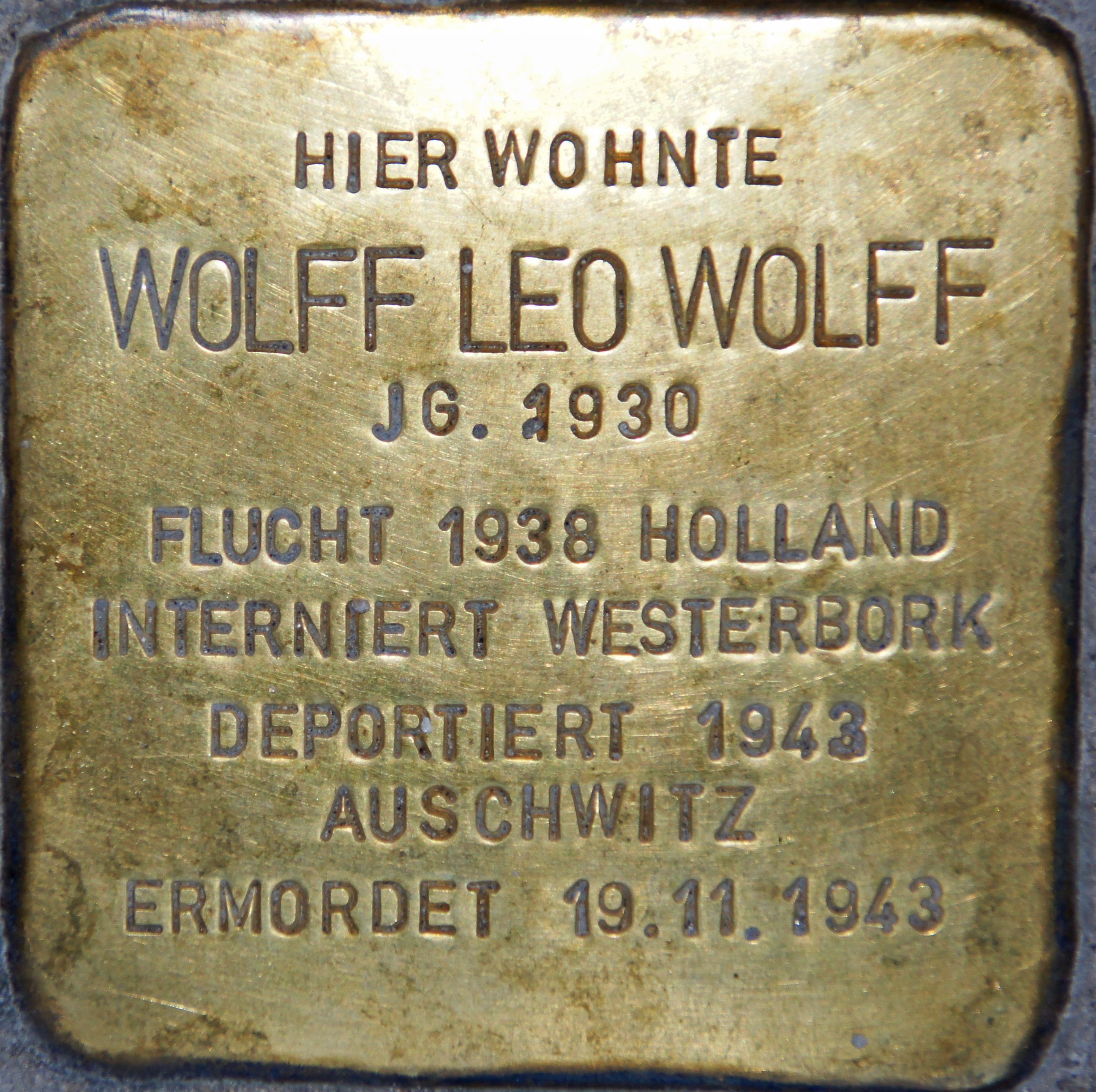 | Wolff Leo Wolff wurde am 11. Juli 1930 als erstes von vier Kindern von Ester Wolff, geb. Hiegentlich (geboren 17.01.1897, ermordet in Auschwitz 19.12.1943) und Leo Wolff (geboren 17.06.1896, ermordet in Auschwitz 2.01.1944) in Aurich geboren. Wolff Leo Wolff musste als 8-Jähriger Aurich verlassen und floh mit seinen Eltern und Geschwistern am 31.Juli 1938 von Aurich nach Amsterdam. Dort kamen die Wolffs bei der Familie Hiegentlich, der Familie seiner Mutter, Ester Wolff, in der Spiegelgracht 7 unter. Seine Familie zieht 1939 in die Weteringschanz 231 in Amsterdam. Aus den Unterlagen des Jüdischen Rates (der Niederlande) erfahren wir, dass sein Vater Leo Wolff als Kaufmann (bzw. Metallkaufmann) seinen Lebensunterhalt sucht. Seine Mutter Ester Wolff ist unter der Adresse als Zahnarztassistentin gemeldet. Von Anfang Mai 1942 an müssen Juden auch in den Niederlanden den gelben Stern mit dem Wort „Jood“ tragen. Im Sommer 1942 schließlich beginnen die Deportationen; bereits 1943 gelten die Niederlande praktisch als „judenrein“. Über das „polizeiliche Durchgangslager“ Westerbork nahe der deutschen Grenze rollen die Züge in die Vernichtungslager. Am 26. September 1943 wird auch Wolff Leo Wolff mit seinen Eltern und seinem Bruder zunächst in Westerbork interniert und am 16. Oktober 1943 nach Auschwitz deportiert. Mit seiner Mutter und seinem Bruder wird er kurz nach der Ankunft in Auschwitz am 19. November 1943 ermordet, sein Vater Leo Wolff einige Zeit später, am 2. Januar 1944.Die zu diesem Zeitpunkt 8-jährige Tochter Hanni Wolff überlebt den Völkermord. Leider konnten wir sie bisher nicht ausfindig machen. | |