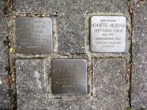 Nur eine Woche vor dem Umzug nach Holland meldete er sich am 25. April 1938 bei der Meldebehörde ab, um nach Bornheim (Kreis Bonn) zu gehen. Was er dort machte, ist unklar. Möglicherweise stammt seine Ehefrau Henriette Hildegard Cahn (geb. 15.6.1915 in Roschdorf) von dort. Im holländischen Mussel kommt am 12.12.1941 die Tochter Goldine zur Welt. Seine verwitwete Mutter, Goldine Hoffmann, bleibt in Aurich und zieht erst zusammen mit den letzten Auricher Juden am 29.02.1940 nach Berlin. Von dort wird sie 1942 nach Riga deportiert und ermordet. Artur Jakob Hoffmann wird Anfang Oktober 1942 im Lager Westerbork interniert, am 26.10.1942 nach Auschwitz deportiert und dort am 28.02.1943 (genauso wie sein Bruder) ermordet. Scheinbar sind beide Familien der Brüder gleichzeitig deportiert worden. Jedenfalls wurden deren Frauen am 29.10.1942 offensichtlich gleich nach der Ankunft ermordet. Auch für Arturs zehn Monate altes Kind ist dieses Todesdatum verzeichnet. ![]() Schüler der Berufsfachschulklasse Bautechnik der BBS Aurich II bei der Verlegung der drei Stolpersteine Für Arthur Jakob Hoffmann, seine Ehefrau Henriette und die kleine Tochter Goldine werden am 7.09.2015 weitere Stolpersteine in Mussel / NL vor dem Haus Zandtangerweg 10 verlegt.