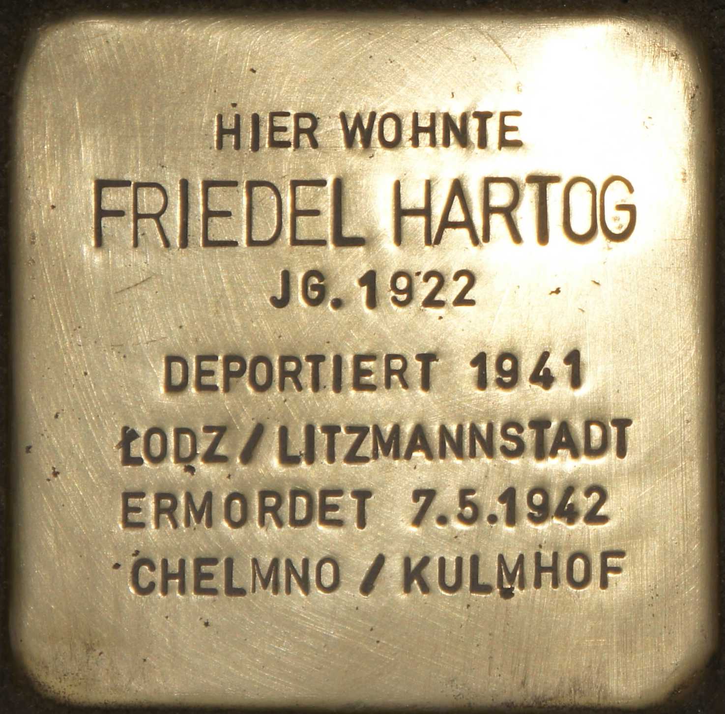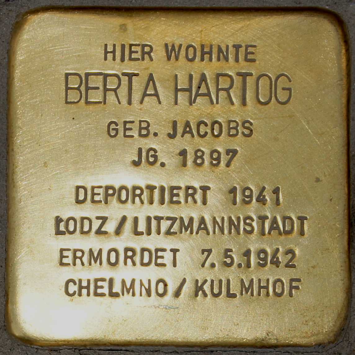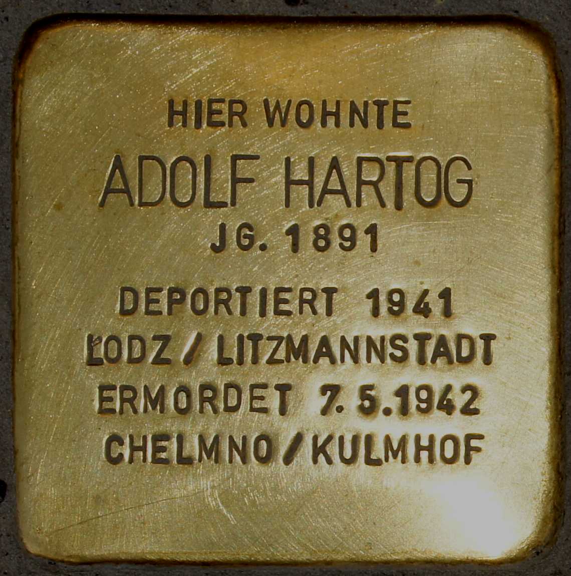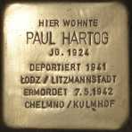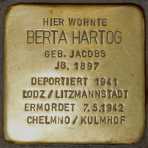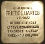 Adolf Hartogs Ehefrau Berta stammte aus Sögel. Zur Familie gehören noch die beiden Söhne Friedel, geboren am 13.08.1922 und Paul, geboren am 14.12.1924. Die Familie hat Aurich am 27.08.1936 verlassen und ist nach Wuppertal–Elberfeld gezogen. Von Düsseldorf aus wurde sie am 27.10.1941 mit einem Sammeltransport in das Ghetto von Litzmannstadt/Lodz in Polen deportiert. Von dort aus wurde die Familie am 6. Mai 1942 in das Vernichtungslager Chelmo/Kulmhof gebracht und am 07. Mai 1942 ermordet.