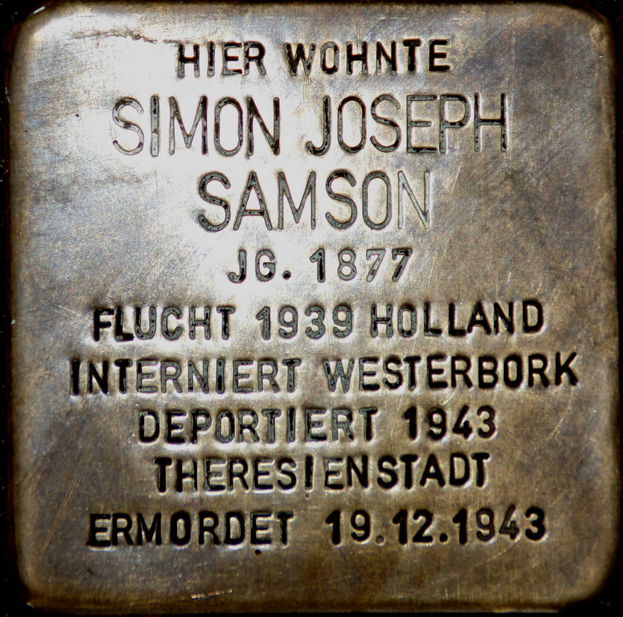 Simon Samson ist das erste Kind von insgesamt vieren der Eltern Joseph (Joseph Marcus van Elkan, genannt Samson) und Johanna (Hendel Stein Hanchen) geborene Blitz. Am 12.11.79 wird die Schwester Jeanette, am 24. 2. 1881 Regina und am 6. 3. 85 Abraham in Aurich geboren. Simon Samson ist Viehhändler. Hinter dem Haus sind Stallungen und Weiden für das Vieh, das er aufkauft und wieder verkauft. Er heiratet Goldine aus der Familie Wallheimer, die ihren Familiensitz am Breiten Weg 1 hat. Im Ersten Weltkrieg ist Simon Frontkämpfer. Das Paar bekommt fünf Kinder: Benni, Jonni, Johanna, Edith und Lotte. Die Verfolgungsgesetze der Nazis ruinieren die wirtschaftliche Basis der Samsons, so dass sie Ende 1938 ihr Haus verkaufen müssen. Jonni wandert am 7. 2. 39 mit seiner Frau Rosi über Bremen nach Kalifornien aus. Zuvor flüchtet Simon Samson mit Ehefrau Goldine zu ihren anderen Kindern nach Nieuw Amsterdam, eine Moorkolonistensiedlung südlich von Emmen. Sein Sohn Benni ist bereits am 18. 10. 38 dorthin vorausgegangen. In dieser Moorkolonie, an der Straße Zijtak Westseite Nr. 26, ist die ganze Familie, mit Ausnahme von Lotte und Johanne, durch die Hilfe eines Nachbarn vom Dommerkanaal – Hielke Bos untergekommen. Eines Tages im Herbst 1942 ist es soweit. Die Deutschen durchkämmen die Häuser und stehen eines Morgens an der Haustür. Edith öffnet, „Wer ist dies?“ fragen sie. „Oh das ist unser Nachbarmädchen“. Edith sieht nicht wie eine Jüdin aus. Sie wird beiseitegeschoben. Später schmuggelt Hielke Bos Edith in einer Ferkelkiste nach Amsterdam, wo sie mit ihrem Mann Siegfried in den Untergrund abtaucht. Benni, der sich hinten im Garten aufhält und das Unheil von vorne gewahr wird, kann Simon noch warnen und auffordern, das vorbereitete Versteck aufzusuchen. Die beiden Alten wollen es jedoch nicht mehr.