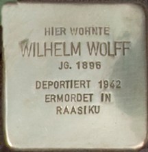Seine Mutter, Amalie Wolff geborene Fromm, war die Besitzerin des Hauses im Krähennestergang1. Amalie Wolff war eine geborene Fromm und hatte Rahel Bamberger und Seligmann Fromm als Eltern. Seligman Fromm, der Großvater von Wilhelm Wolff, war somit höchstwahrscheinlich der Cousin des berühmten Psychoanalytikers Erich Fromm (1900-1980). Seine Geschwister waren Abraham Wolff, der 1919 im 1. Weltkrieg fiel, und Recha, geboren 1.10.1900, für die ebenfalls am Krähennestergang 1 ein Stolperstein verlegt wird. Wilhelms Vater hieß Benjamin Wolff und ist am 5. Februar 1854 geboren. Er war lange Lehrer an der jüdischen Volksschule Aurich und anschließend „Ruhelehrer“. Einer Anzeige kann man entnehmen, dass er am 28. August 1934 „plötzlich und unerwartet, aber sanft“ gestorben ist. Wilhelm Wolff hat mit der Familie van der Wall zusammen im Krähennestergang1 gewohnt. Er war Kultusbeamter und blieb ledig. Zwischen dem 14.01.1927 und dem 1.04. 1929 war er in Leer am Standort der Synagoge gemeldet. Vom 1.01.1932 bis 1.10.1933 wohnte Wilhelm in Mayen in der Eifel. Vom 9.11. bis 23.12.1938 wurde er in das Konzentrationslager Sachsenhausen deportiert. Das war eine häufige Strafaktion nach der Pogromnacht. Von dort kehrte er aber noch einmal nach Aurich zurück. Zum 1.04.1940 sollte Aurich „judenfrei“ sein. Deswegen verließ Wilhelm mit Recha Aurich mit Ziel Berlin. Am 26.09.1942 wurden beide, ausgehend von dem in einer ehemaligen Synagoge eingerichteten Sammellager vom Güterbahnhof Putlitzstraße nach Raasiku, nahe dem heutigen Tallin deportiert. Dieses Lager war als Tötungsstätte eingerichtet. Vermutlich wurden Wilhelm und Recha Wolff bald nach der Ankunft getötet. Von 1.049 Deportierten dieses Zuges haben nur 26 überlebt.
