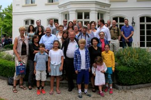 Zur Verlegung durften wir insgesamt 33 Angehörige und Gäste aus den USA, Israel, Großbritannien und Deutschland begrüßen, darunter alleine 21 Angehörige der Familie Zuns, die sich hier mit uns (Brigitte Weber ganz links, Günther Lübbers obere Reihe links) vor dem Hotel „Hochzeitshaus“ aufgestellt haben.