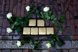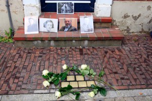Die sechs Stolpersteine mit Fotos der mit Rosen geehrten früheren Bewohnern.