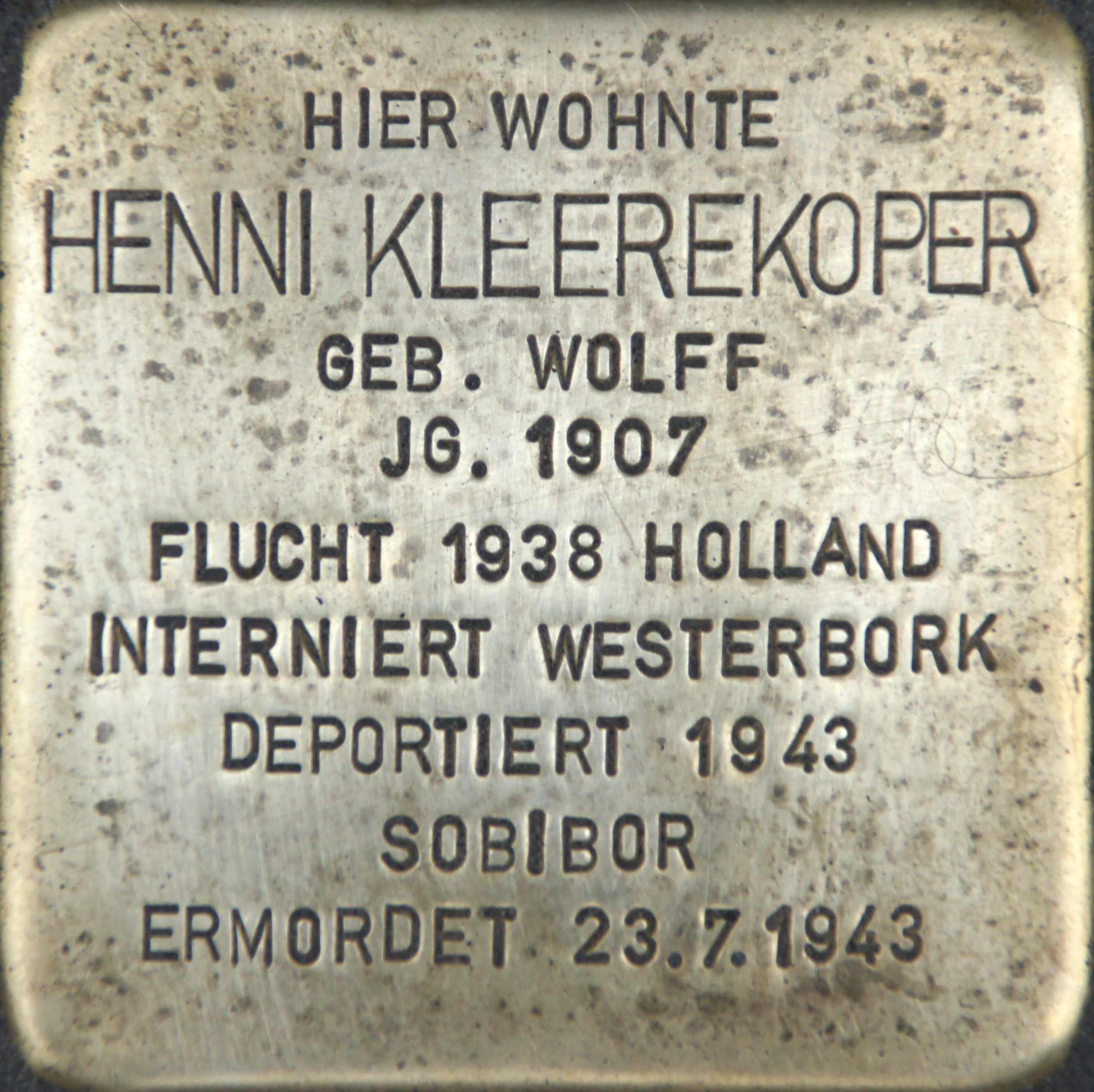 | Henni Kleerekoper wird am 17. April 1907 als Henni Wolff in Aurich geboren. Ihre Eltern sind Wolff Jonas Wolff und Jeanette geborene Samson. Sie hat noch zwei Brüder – Jonas und Josef. Die Familie wohnt im Haus Marktstraße 15. Ihr Vater ist Schlachter. Nach den Umständen zu urteilen ist die Familie arm. Alle Geschwister verlassen in jungen Jahren das Elternhaus, um Arbeit an vielen Stellen in Deutschland, wie es in dieser Zeit aus Zwang und Not üblich ist, zu finden.