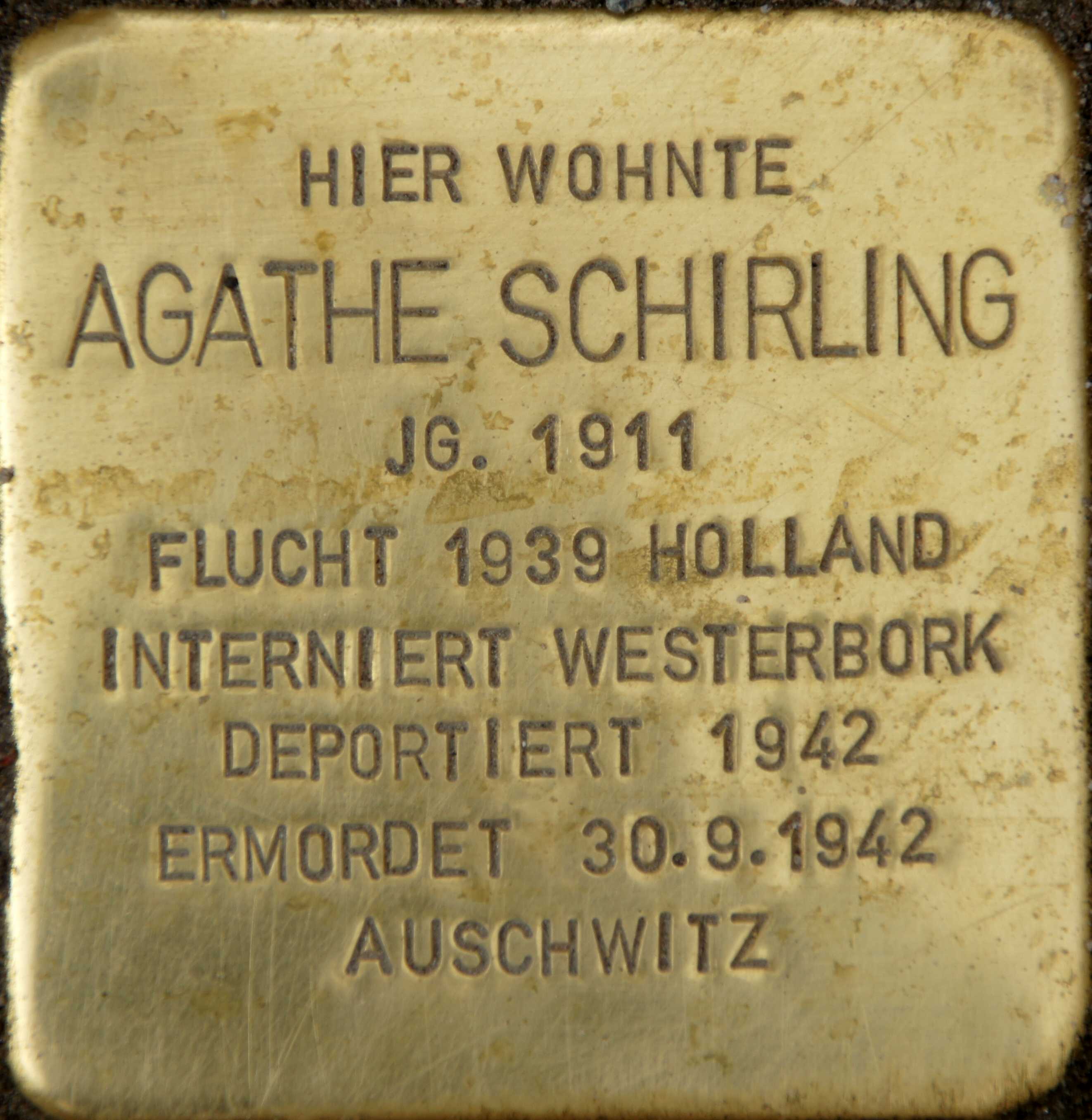 Agathe Schirling ist das dritte Kind und dritte Tochter des Lehrers Menko Schirling und seiner Frau Frieda, geb. Stern. Agathes ältere Schwestern heißen Ilse und Jenni. Die Familie zieht 1925 durch den Beruf des Vaters nach Hoof im Schwalm-Eder-Kreis. Menko Schirling ist dort der letzte Lehrer der kleinen jüdischen Gemeinde. Dort ist er 1936 als letzter auf dem jüdischen Friedhof begraben. Die Israelitische Volksschule wurde Anfang 1934 aufgelöst. So gehen alle drei Schirling-Schwestern als Hausgehilfinnen nach Norddeutschland in jüdische Haushalte. Agathe meldet sich am 18.05.1933 in der Leerer Straße 24 an. Sie ist Hausgehilfin im Haushalt von Erich Sternberg, wie die Meldekarte vermerkt. Ihre ältere Schwester Jenni war schon vorher in Ostfriesland, zuerst in Leer, Ostersteg 67, dann in Aurich bei Wallheimer, Kirchdorfer Weg 36 und zuletzt bei Lippmann Knurr in der Norderstraße 2. Jenni verläßt Aurich 1934 nach Twistringen. Sie heiratet Paul Vogel aus Hoof. Agathe wird festgenommen und zusammen mit den Cohens nach Westerbork verbracht. Am 28.09.1942 wird sie mit 609 weiteren nach Auschwitz deportiert. Die Familie Cohen dagegen wird nach Sobibor deportiert und bei Ankunft umgebracht. Nur das dritte Kind der Cohens kann in Amsterdam versteckt werden und überlebt. Am 30.09.1942 ist der Transport mit Agathe in Auschwitz angekommen. Dieser Tag ist als ihr Todestag anzusehen, denn es gibt keine Einträge über sie in den Auschwitzer Häftlingsregistern. Agathes Schwester Ilse, deren Mann Arthur Cohen aus Neustadtgödens, deren gemeinsame Kinder Ingrid und Hannelore sowie Agathas Mutter, Frieda, müssen zusammen nach Vegesack in ein Judenhaus in der Hafenstraße 23 ziehen. Sie werden alle zusammen am 28.07.1942 nach Minsk deportiert und dort an offenen Gruben erschossen. |