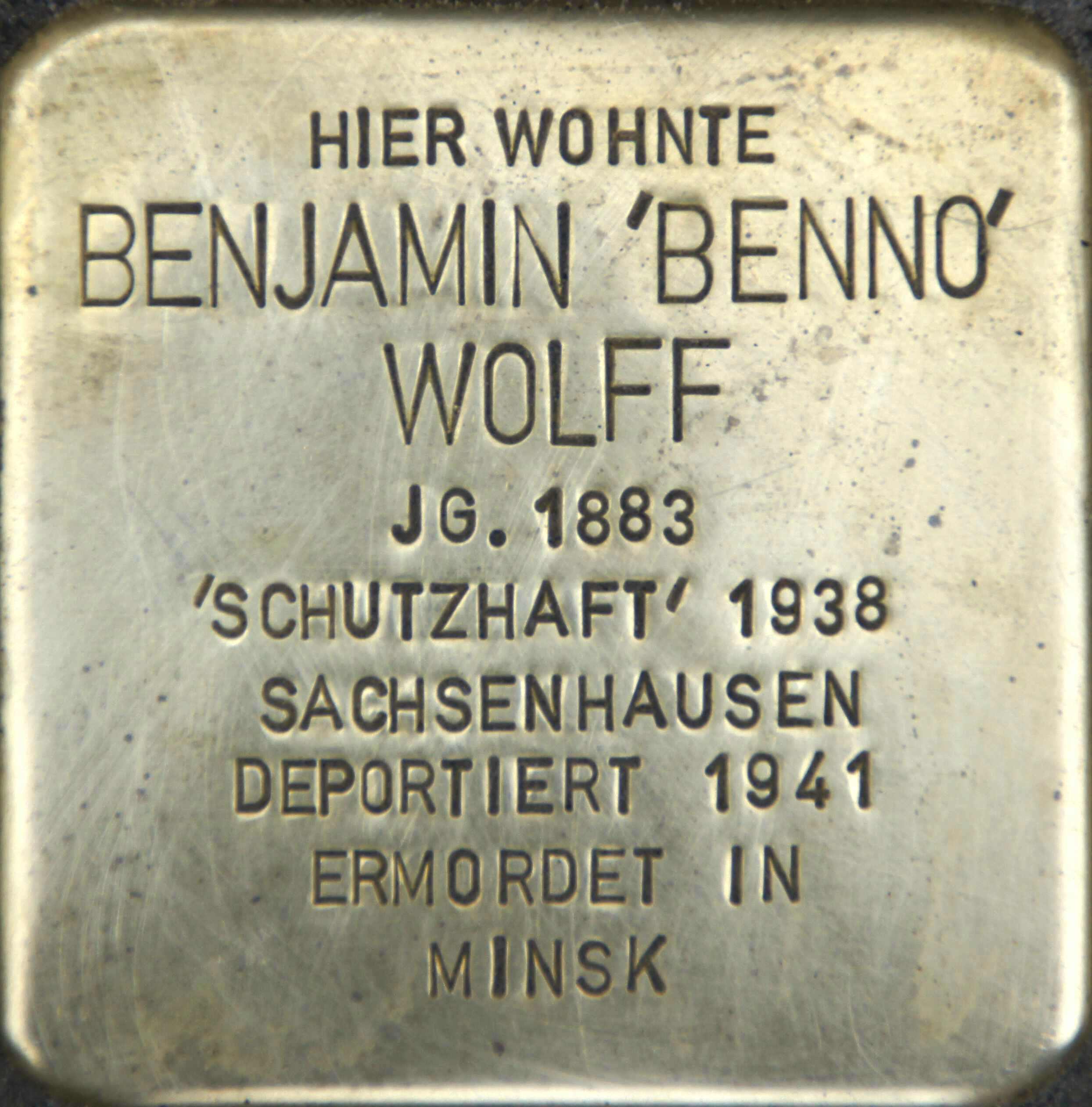 Benjamin hatte zwei Schwestern und sechs Brüder. Die Familie wohnte in der Marktstraße 2. Wie sein Vater wurde auch Benjamin Wolff, genannt Benno, Schlachter. Benjamin und Regina Wolff bekamen drei Töchter. Karoline wurde 07.08.1920 geboren, Fanni am 24.09.1921 und Selma am 15.06.1923. Ihr Name ist im Geburtsregister mit Sara Benjamin angegeben. Die Familie muss in dem Haus Marktstr. 2 zwischen 1926 und 1933 verschiedene Hausmädchen gehabt haben. Es galt als völlig normal, dass christliche Mädchen und Frauen besonders aus den umliegenden Dörfern in Geschäften und Haushaltungen von Auricher Juden angestellt waren. Das wurde mit dem „Gesetz zum Schutz des deutschen Blutes und der deutschen Ehre“ vom 15. September 1935 anders. Bis Ende September 1935 wohnte auch ein Angestellter mit in dem Haus. Seine Töchter haben bereits seit 1936 Aurich verlassen. Die älteste, Karoline, zog im April 1936 nach Wuppertal-Elberfeld, die zweite, Fanni, ging im Juni 1936 auf das Gut Spreenhagen in der Mark, im Juni 1937 nach Mannheim und kam im Februar 1939 nach Aurich zurück und ging im Juni 1939 erneut nach Spreenhagen in der Mark Brandenburg, wo z.B. junge Menschen auf die Auswanderung nach Palästina vorbereitet wurden. Die jüngste Tochter Selma zog am 1. Mai 1938 nach Mannheim. Ihr Vater, Benjamin, wurde nach der Pogromnacht im November 1938 bis zum 17. Dezember 1938 im Konzentrationslager Sachsenhausen inhaftiert. Unter dem zunehmenden Druck haben beide Eltern Benno und Regina Wolff Aurich verlassen und sind am 27. Februar 1940 nach Düsseldorf gezogen, am gleichen Tag wie Reginas Schwester Marianne Kussel und ihr Mann Hugo. Das Ehepaar Wolff lebte dort in der Steinstr. 33. Am 10.11.1941 gehörte es zu den 997 Deportierten, die von Düsseldorf-Derendorf aus nach Minsk deportiert wurden. In diesem Zug waren ebenfalls Marianne und Hugo Kussel und deren 16-jährige Tochter Elfriede. Sie wurden alle in Minsk ermordet. |