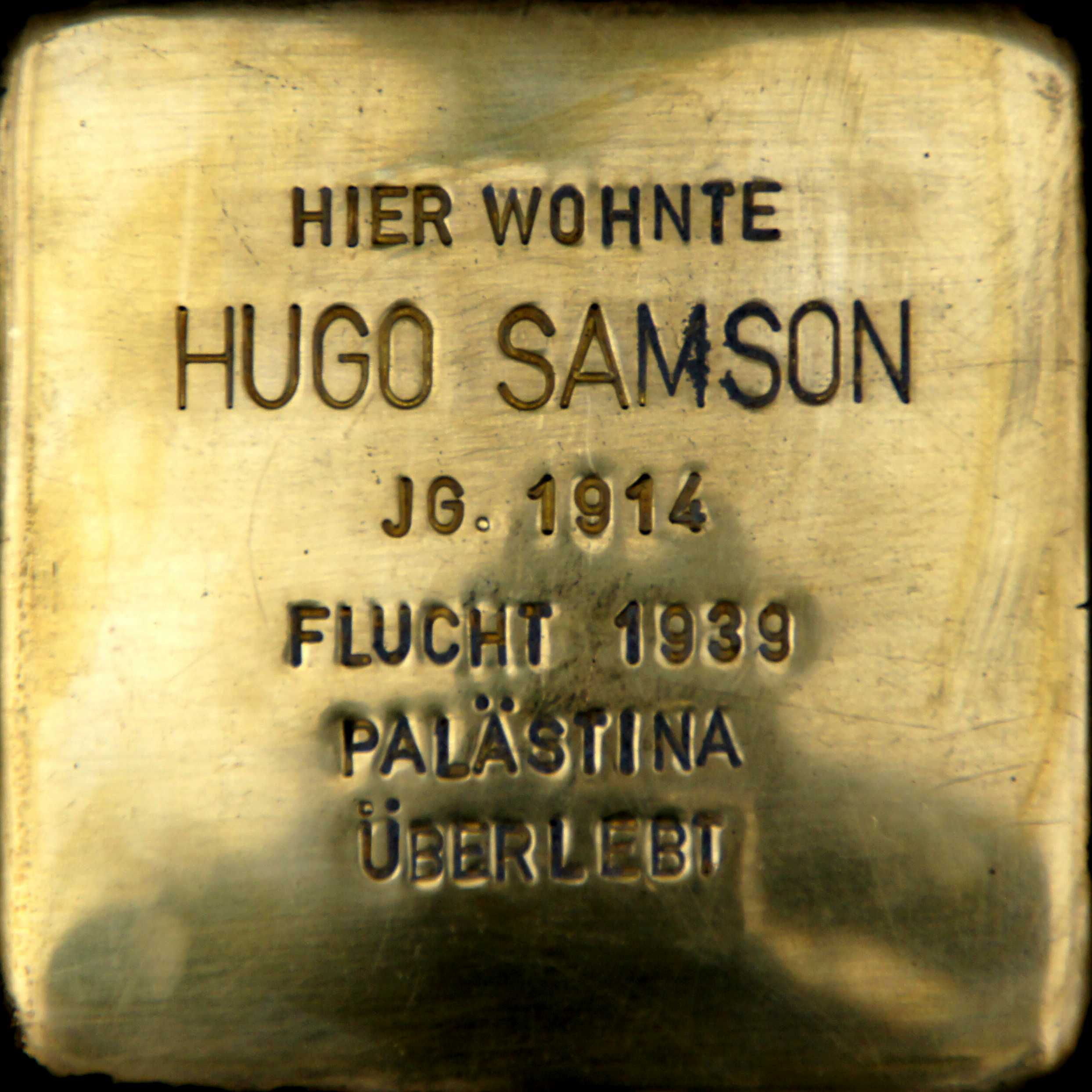 Hugo wird am 22. Januar 1914 in Aurich geboren als jüngstes Kind der Eltern Jakob Hartog Samson und Jenny Salomon, genannt „Minna“, geb. Windmüller. Er hat zwei ältere Schwestern, Resi und Betti. Sein Vater Jakob betreibt mit Hugos Onkel Simon Hartog eine Schlachterei in der Marktstraße 19 in der er auch mitarbeitet. Hugo verbringt langjährige Lehr- und Wanderzeiten als Schlachtergeselle an vielen Orten in Deutschland. Er muss ohnehin eine besondere Kraftnatur gewesen sein, was sich im Weiteren erzählen lässt.