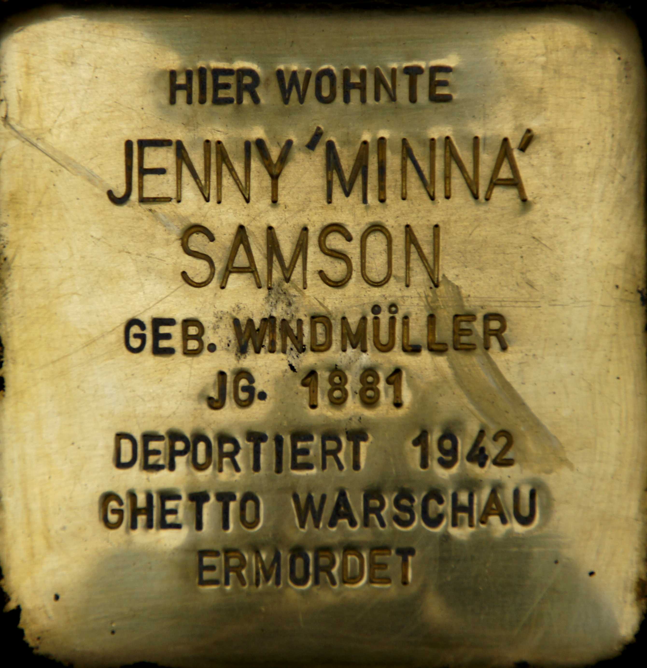 | Jenny Salomon gen. „Minna“ Samson geb. Windmüller wird am 26. September 1881 in Emden geboren. Sie heiratet 1908 den Schlachter Jakob Hartog, welcher 1934 stirbt. Jenny hat drei Schwestern und einen Bruder. Ihre Zwillingsschwester Betti ist die erste Frau von Jakob Hartog. Als diese 1905 kinderlos stirbt heiratet Jakob Jenny. Jakob betreibt mit seinem Bruder Simon Hartog Samson einen Schlachterbetrieb in der Markstraße 19 und auf Norderney in der Winterstraße 5.