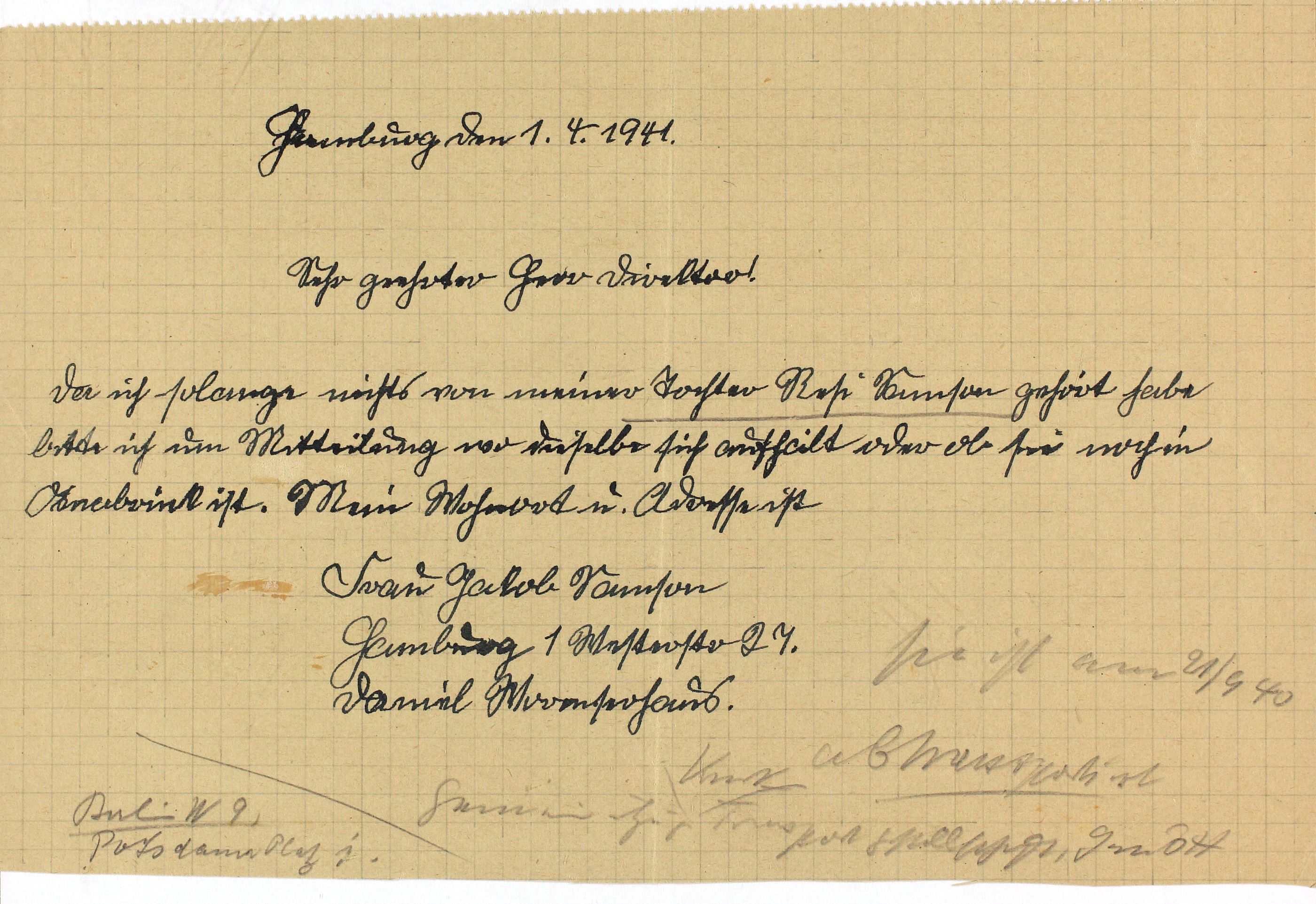 Jenny bekommt drei Kinder: Hugo, Betti und Resi. Hugo lernt Schlachter und arbeitet an vielen Stellen in Deutschland. Die Töchter gehen in Stellung in jüdischen Ferienheimen und Pensionen vorwiegend auf Norderney, weiter in Emden, Groningen, Farmsum und Esens. 1937 erkrankt Jennys Tochter Resi psychisch und kommt erstmalig in der privaten Heil- und Pflegeanstalt Ilten bei Hannover unter. Wieder in Aurich veranlasst die Mutter eine neue Einweisung ihrer Tochter. Ein Dr. Müller aus Aurich vermerkt: Frl. Samson ist seit mehreren Wochen geistesgestört, sie ist sehr bösartig und wird handgreiflich. Anstaltsaufnahme ist notwendig. In der Familie mütterlicherseits sind mehrere Familienmitglieder gemütskrank, Resi nach eigenem Bekunden nervenkrank. Am 1.04.1941 schreibt Jenny, zum Zeitpunkt als ihre Tochter bereits vor einem halben Jahr in Brandenburg ermordet wurde, an den Direktor der Heil- und Pflegeanstalt: Sehr geehrter Herr Direktor: Da ich solange nichts von meiner Tochter Resi Samson gehört habe, bitte ich um Mitteilung, wo dieselbe sich aufhält oder ob sie noch in Osnabrück ist. Der Anstaltsleiter Kracke macht dazu eine Bleistiftnotiz: Sie ist am 21/9 40 abtransportiert – Gemeinnützige Transportgesellschaft mbH Berlin W9 Potsdamer Platz 1. (Foto s. unten) Der Anstaltsleiter weigert sich die Fragebögen (zur Selektion) der „Reichsarbeitsgemeinschaft Heil- und Pflegeanstalten“ auszufüllen, bzw. legt der Anzahl nicht genügend vor, so dass am 8. Mai 1941 ein Schreiben an die aufsichtsführende Behörde ergeht: „Sehr geehrter Herr Landesrat! Auf Ihr Schreiben erwidere ich Ihnen, dass die Herren Dr. Steinmeyer und Dr. Sträub beauftragt waren, in Osnabrück eine Nachprüfung vorzunehmen. Diese Nachprüfung ist deswegen notwendig, weil die Anstalt Osnabrück unverhältnismässig wenig Meldebogen übersandt hatte. Ich bitte Sie, sich zunächst über die Art der Ausfüllung der Meldebogen eingehend berichten zu lassen und mir diesen Bericht zugänglich zu machen. Ich betone schon jetzt, dass nach meinem Dafürhalten die Anstalt Osnabrück wesentlich mehr Meldebogen hätte ausfüllen müssen, und dass sich ein Besuch durch Beauftragte der Reichsarbeitsgemeinschaft Heil- und Pflegeanstalten wohl kaum umgehen lassen wird. Heil Hitler! gez. Heyde . Anm.: Dr. Heyde, verantwortlich für die Ermordung von 100.000 Menschen, nennt sich nach dem Krieg Dr. Sawade und arbeitet unbeschadet als nervenärztlicher Gutachter für viele Institutionen in Schleswig-Holstein. Erst die Ermittlungen des Frankfurter Generalstaatswaltes Fritz Bauer machen diesem ein Ende. Sawade begeht vor Prozessbeginn am 13. Februar 1964 im Zuchthaus Butzbach Selbstmord. Die Geschichte der Aufdeckung Heydes ist zugleich die exemplarische Geschichte der fortgesetzten Vertuschung krimineller Handlungen früherer Staatseliten. Beteiligt in der Heyde-Sawade-Affäre waren unzählige bis in höchste Staats- und Verbandsspitzen. Jenny zieht zu ihrer Tochter Betti und Ehemann nach Hannover in der Celler Straße 152. Kurz vor der Deportation werden Jenny, ihre Tochter Betti und Ehemann Alfred in dem nahegelegenen KZ Ahlem, einst eine israelitische Gartenbauanstalt und Hachschara[1]-Schule (Foto s. unten), zur Sammlung inhaftiert. Am 31.03.1942 werden alle in das Ghetto Warschau deportiert. Im Wege der Ghettoräumung werden sie wahrscheinlich weiter nach Treblinka deportiert. Von Jenny Samson, genannt Minna, gibt es nach dem 31.03.1942 kein Lebenszeichen mehr.
