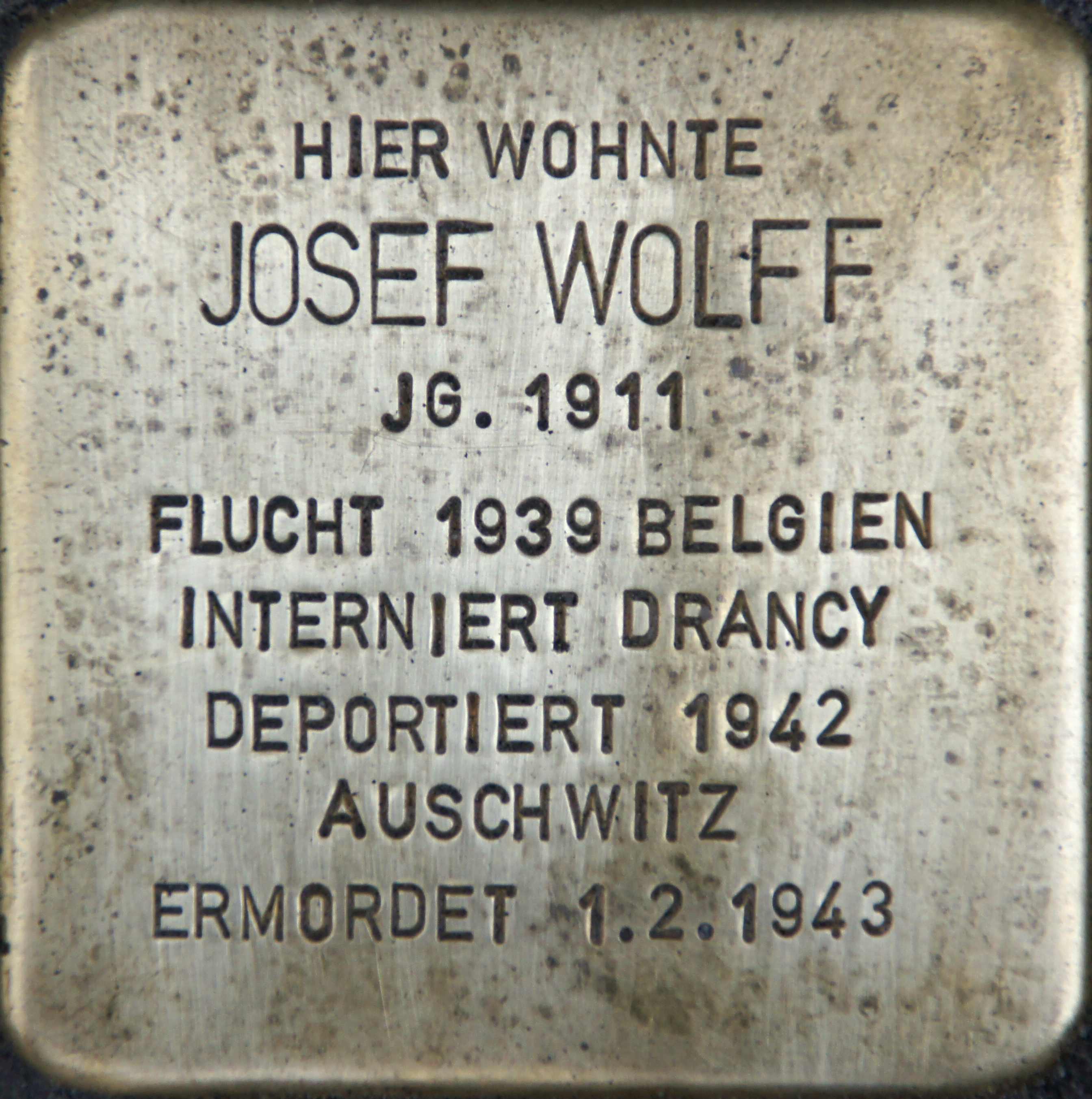 Josef Wolff wird am 18. April 1911 in Aurich geboren. Seine Eltern sind Wolff Jonas Wolff und Jeanette geb. Samson. Er hat noch einen älteren Bruder Jonas und eine ältere Schwester Henni. Die Familie wohnt im Haus Marktstraße 15. Sein Vater ist Schlachter. Nach den Umständen zu urteilen ist die Familie arm.