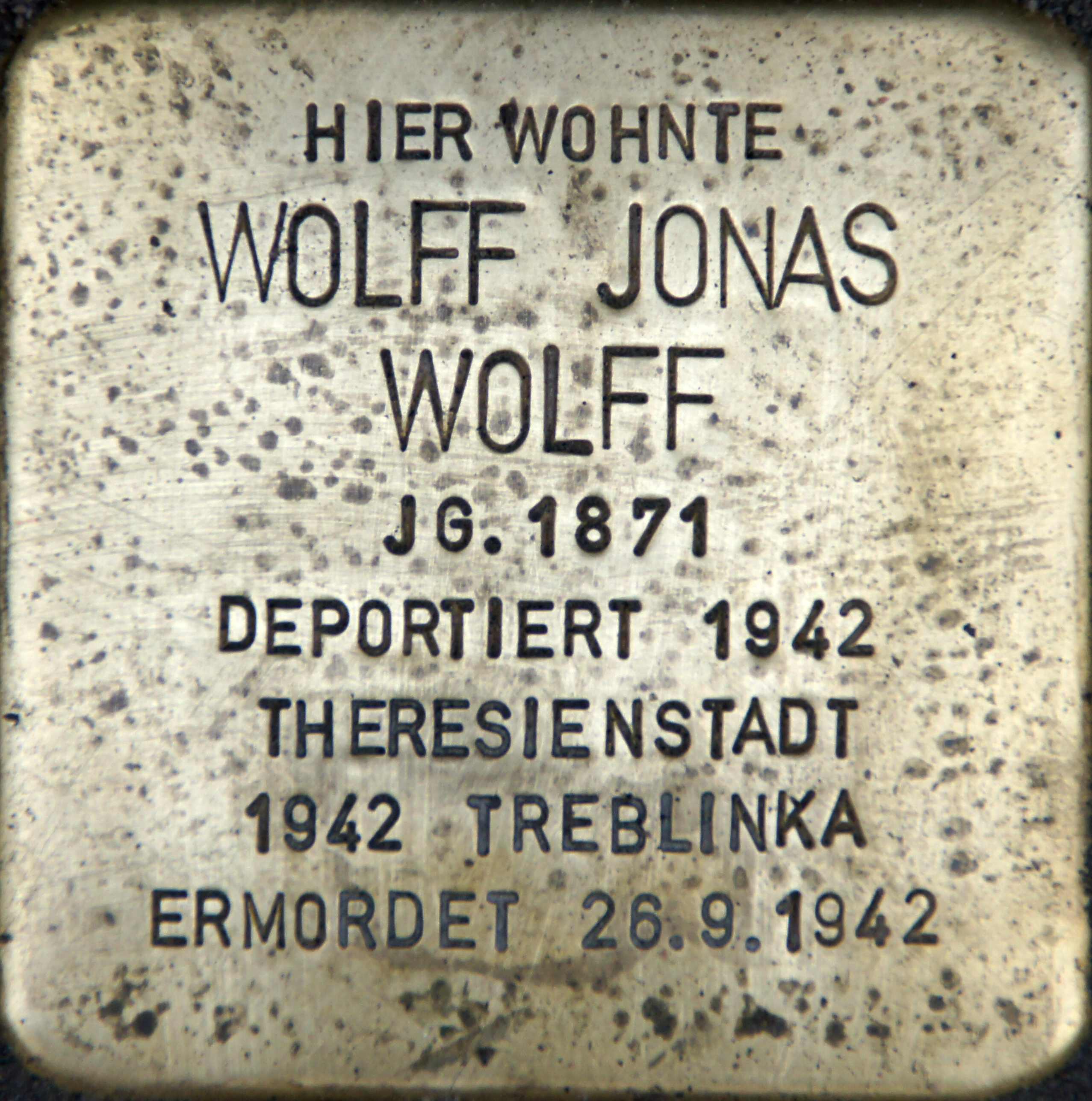 | Wolff Jonas Wolff wurde am 29. 5. 1871 geboren. Seine Eltern waren Jonas Wolff Wolff und Hendel Moses Pels, aus Emden stammend. Er hat neun weitere Geschwister, wovon allerdings nur drei das Erwachsenenalter erreichen. Wolf Jonas Wolf ist Schlachter, wahrscheinlich nur Fleischzerleger, nicht Schächter. Er ist mit Jeanette (Joseph) geborene Samson verheiratet. Das Paar bekommt drei Kinder: Jonni, Henni und Joseph.