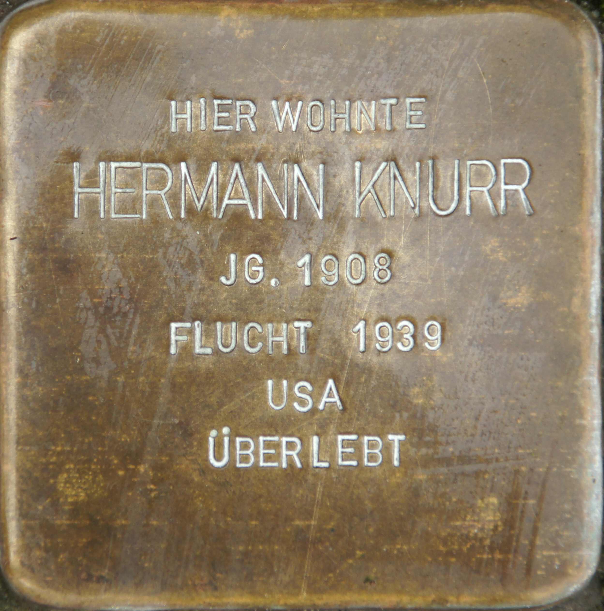 | Hermann Knurr wird am 02. Oktober 1908 als sechstes von sieben Kindern des Kaufmanns Lippmann und Ida Knurr, geb. Bienheim, geboren. Wie sein Vater und seine Brüder wird er Kaufmann. Von 1924 bis 1927 macht er in Halberstadt eine Lehre zum kaufmännischen Angestellten, nach seiner Rückkehr nach Aurich arbeitet er im väterlichen Betrieb, dem Geschäft „H. C. Knurr“ mit und wird gemeinsam mit seinem älteren Bruder Erich schließlich Teilhaber.