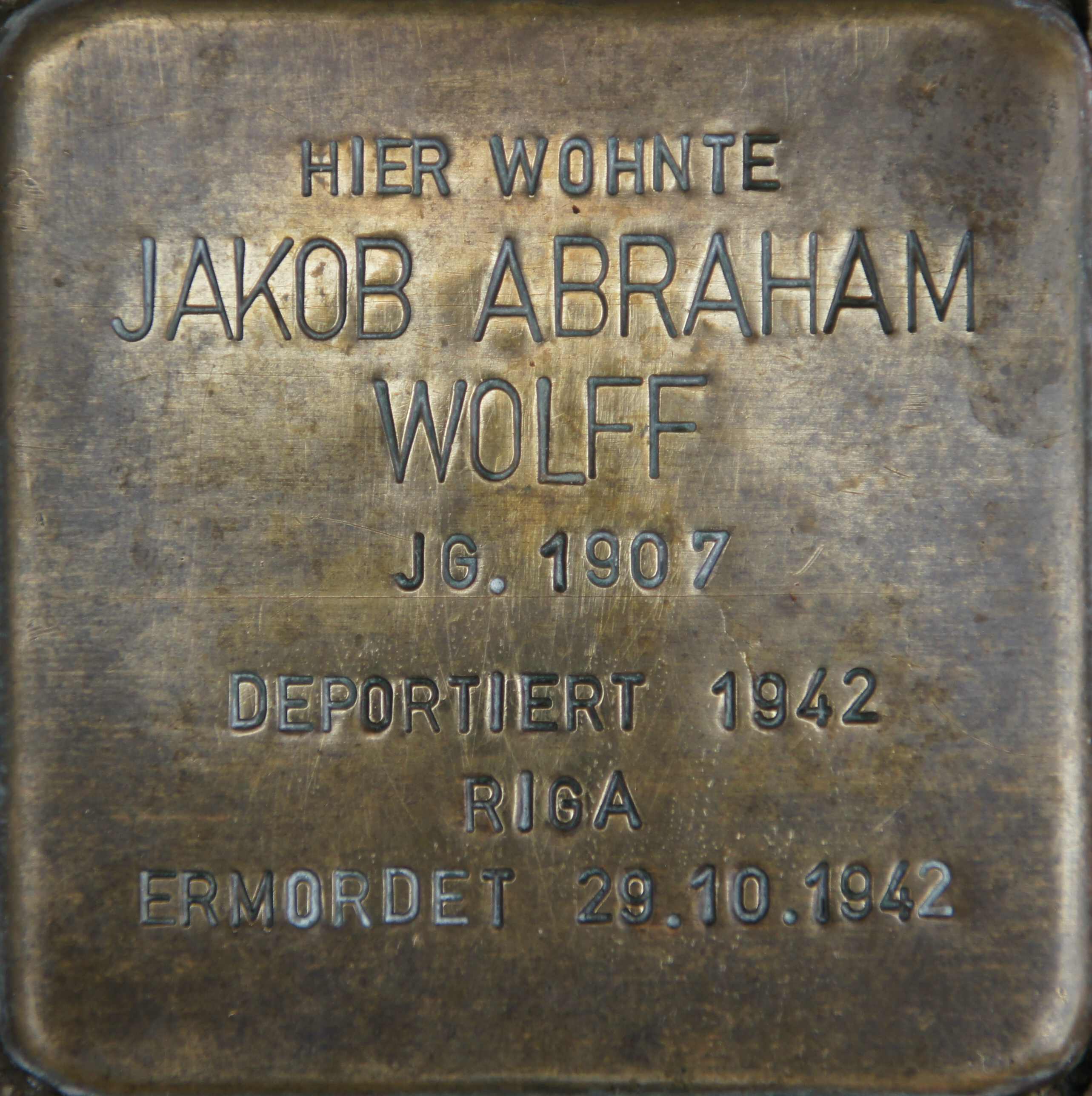 Jakob Abraham Wolff wird am 25. Februar 1907 in Aurich geboren. Er ist das dritte von neun Kindern von Abraham Levy und Hedwig Wolff, geb. von/van der Walde. Abraham Levy Wolff, der Vater von Jakob, betreibt in Aurich einen Viehhandel. Ihm gehören das Haus in der Lilienstraße 12, in dem die Familie wohnt, sowie Acker- und Weideland im Hammerkeweg. Als Jakob gerade erst sechzehn Jahre alt ist, verstirbt sein Vater Abraham an einer Lungen- und Kehlkopftuberkulose. Jakobs ältere Brüder, Nachmon und Ludwig, führen nun das Geschäft des Vaters fort. Auch Jakob selbst steigt später in den Familienbetrieb ein und arbeitet wie sein Vater und seine Brüder als „Schlachter und Viehhändler“. Während Jakobs Geschwister Ludwig, Erna, Herta und Alfred in den folgenden Jahren heiraten und eigene Familien gründen, bleibt Jakob wie sein ältester Bruder Nachmon ledig. Gemeinsam mit ihrer Mutter und der jüngsten, im Todesjahr des Vaters geborenen Schwester Ruth leben die beiden Brüder im Haus in der Lilienstraße 12.Durch Boykottaktionen und Repressalien durch das NS-Regime dürfte die finanzielle Lage der Familie ab 1933 immer schwieriger geworden sein. Vermutlich sind es jedoch die Ereignisse vom 09. November 1938, die für Jakobs Mutter Hedwig den Ausschlag dazu geben, Aurich zu verlassen und zu versuchen, sich in den Niederlanden eine neue Existenz aufzubauen: In jener Nacht werden alle männlichen jüdischen Einwohner Aurichs verhaftet und in der sogenannten „Bullenhalle“ in der Emder Straße zusammengetrieben. Nachdem sie dort während der Nacht allerhand Schikanen über sich ergehen lassen müssen, dürfen die Alten und Kranken am nächsten Morgen wieder gehen. Die als „arbeitsfähig“ eingestuften Männer werden jedoch zum Ellernfeld getrieben, wo sie den ganzen Tag über unsinnige Erdarbeiten oder „Exerzierübungen“ zur allgemeinen Erheiterung der Zuschauer durchführen müssen. Es ist unklar, ob Jakob unter jenen Männern ist, die auf dem Ellernfeld schikaniert und dann um 18 Uhr ins Auricher Gefängnis gesperrt wurden. Unter den insgesamt einundvierzig Verhafteten befindet sich jedoch sicher Jakobs ältester Bruder Nachmon, der schließlich am 12. November über Oldenburg ins Konzentrationslager Sachsenhausen verbracht wird. Nachmon bleibt rund einen Monat in Haft, er kehrt erst am 15. Dezember wieder zurück nach Aurich. Jakobs Schicksal ist an diesem Punkt unklar: Die Verhaftung der „arbeitsfähigen“ Männer durch die Nationalsozialisten zielte darauf ab, den Familien mit dem „Ernährer“ die Einkommensgrundlage zu entziehen und sie somit zum Verkauf ihres Besitzes und zum Verlassen Deutschlands zu zwingen. Da sich auf Jakobs Fotokennkarte der Hinweis findet, Jakob sei geistig behindert gewesen, besteht die Möglichkeit, dass Jakob, sofern er als nicht dazu geeignet, den Viehhandel allein zu betreiben, eingeschätzt wurde, nicht nach Sachsenhausen verbracht wurde. Wenige Monate nach der Rückkehr Nachmons aus der Haft verlässt Jakobs Mutter Hedwig gemeinsam mit Jakobs Schwester Ruth Aurich. Jakob und sein Bruder bleiben jedoch in der Stadt und bewohnen weiterhin das Haus in der Lilienstraße 12, wo im Juni 1939 auch weitere Familienmitglieder und andere Angehörige der jüdischen Gemeinde Unterschlupf gefunden haben: Neben Ludwig Wolff, Jakobs Bruder, und dessen Familie ist auch der Kaufmann Lippmann Knurr unter dieser Adresse gemeldet. Spätestens im Oktober 1939 hat nur noch Jakob eine Anstellung, denn er wird in den Einwohnermeldelisten als „Arbeiter“ geführt, sein Bruder Nachmon, mit dem er sich den „Hausboden“ im Gebäude in der Lilienstraße teilt, ist arbeitslos. Als alle in Aurich verblieben Juden zu Beginn des Jahres 1940 die Aufforderung erhalten, den Regierungsbezirk bis zum 01. April zu verlassen, müssen auch Jakob und sein Bruder ihrer Heimatstadt den Rücken kehren. Obwohl die Mutter Hedwig sowie sämtliche Geschwister nach Holland geflohen sind, melden sich Jakob und Nachmon nicht in die Niederlande, sondern nach Berlin ab. Beide Brüder leben dort in der Neuen Friedrichstraße 77. Rund zweieinhalb Jahre später, am 26. Oktober 1942, werden sie gemeinsam mit dem Transport 22 (Osttransport) nach Riga verschleppt. Der Zug traf dort drei Tage später, am 29. Oktober, ein. Hier verliert sich die Spur beider Männer. Im Zuge der Rückerstattungsverfahren, die ihre Schwester Erna, die einzige Überlebende der Familie, später anstrengt, werden beide Brüder 1955 für tot erklärt.