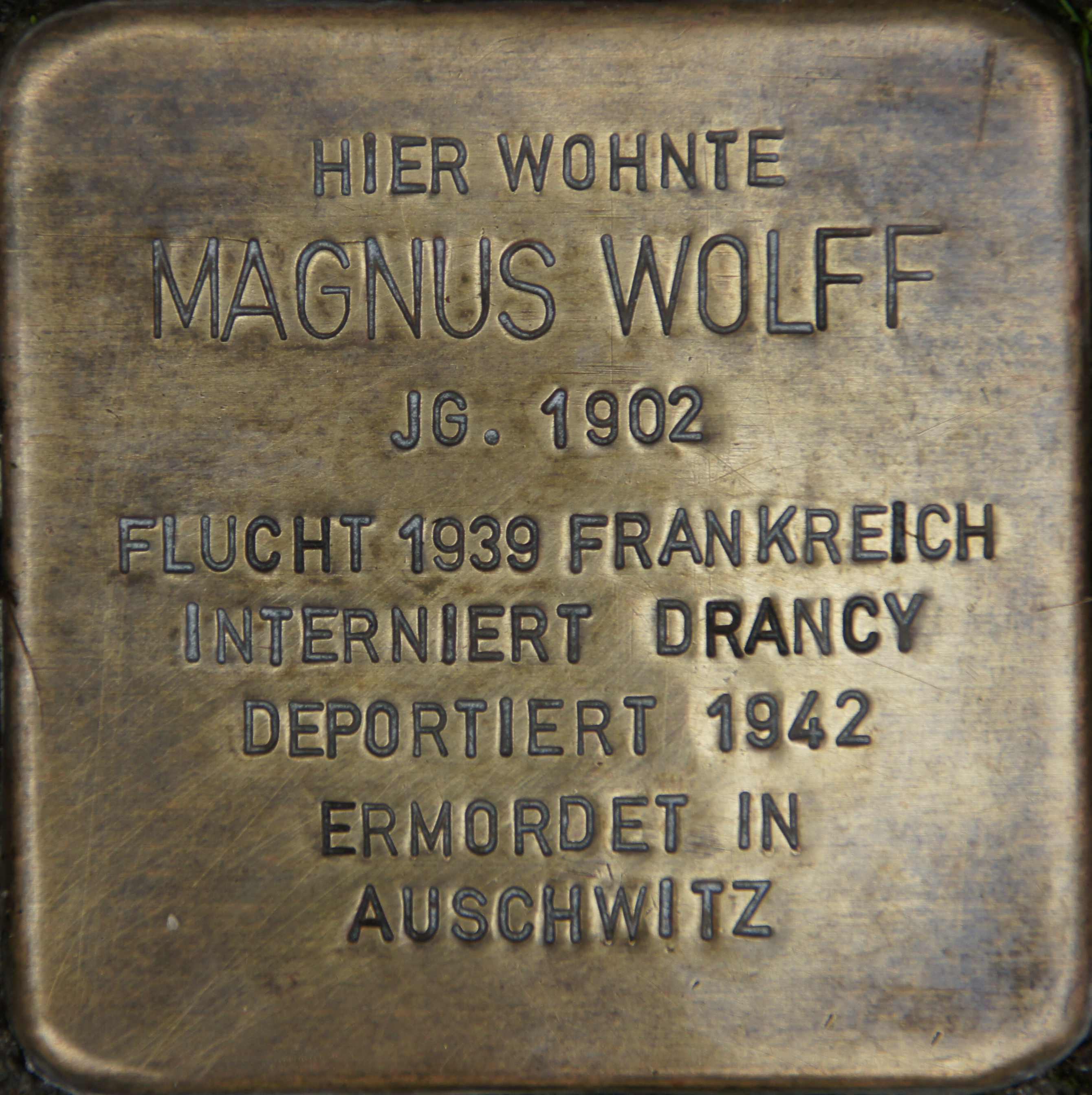 Henriette von der Walde (Lt. Geburtenregister 1844-1931: „van der Walde“) wurde am 24. Juli 1875 als einziges Kind von Magnus Abraham von der Walde (1848 – 1932) und Karoline Gütel Levy, geb. Wolf (1853 – 1917) in Aurich geboren. In einer Mail berichtet Laura Hillman über ihren Großvater, dass er immer hilfsbereit gewesen sei und anderen oft aus finanziellen Schwierigkeiten geholfen habe, oft so, dass diese nicht bemerken konnten, woher die Hilfe kam. Kalli Gramberg erzählt im 3. Band seiner Rückblicke auf die Auricher Geschichte über den Schlachter Selly Wolff folgende Anekdote: „Als seine vielen Kinder noch klein waren, saßen sie oft auf den Steinen des Bürgersteigs. Selly rief: “Jonni, Luti, Abi“ (usw.)“wollt ihr wohl mit de blode Moors von de kalte Schteine ab!“ Selly Wolff verstirbt am 23. August 1930. Seine Söhne Ludwig , Magnus und Abraham, die schon 1926 als Schlachter und Viehhändler in der Lilienstraße 9 aufgelistet werden, führen das Geschäft ihres Vaters unter seinem Namen weiter. Magnus Wolff, geboren am 16.05.1902, ist das 6. Kind von Selly und Henriette Wolff, geb. von der Walde. Magnus arbeitet zunächst bei seinem Vater als Schlachter und Viehhändler. Schüler der Berufsfachschulklasse Bautechnik der BBS Aurich II mit den zu verlegenden Stolpersteinen