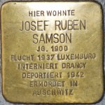 1928 beantragt die Mutter Amalia einen Staatsangehörigkeitsausweis für ihren Sohn. Dieser will Carla Hoffmann aus dem Saarland heiraten. Das Saarland, damals noch unter französischer Verwaltung, gehört nicht zum Reichsgebiet. Das Amt befindet [zu dieser Zeit noch], dass die Eltern beide deutsch sind, … denn sie haben immer in Aurich gewohnt [sic]. Josef heiratet am 13. 4. 28 in Dillingen Carla Hoffmann. Am 3. 6. 28 zieht das junge Paar nach Aurich Am Neuen Hafen 2. Dieses Haus hat der Schwiegervater Adolf Hoffmann 1928 gekauft. Adolf Hoffmann stammt selbst aus Aurich Wallstraße 20. Am 30. 1. 31 wird das erste und einzige Kind Sonja geboren. Die Ehe erweist sich aber nicht als glücklich. Die Mutter, Carla, ist oft außer Haus und eine Kinderpflegerin kümmert sich um Sonja. Josef und Carla erkennen früh die Zeichen der neuen Zeit. Bereits am 13. Mai 1937 verlassen sie Aurich und ziehen nach Frankreich. Sonja selbst wird bereits ein Jahr vorher nach Luxemburg gebracht. Dort in Ringelerhof, ein Einödhof an der Nordwestgrenze, sind die Mutter der Ehefrau und ihr Bruder Ludwig ausgewandert. Josef und Carla treffen ihre Tochter erst wieder in Frankreich. Josef meldet sich als Freiwilliger zur französischen Armee und wird auch eingeschrieben. Mit Kriegsausbruch 1939 werden beide interniert. Joseph Samson kann vor dem Verlassen des Reichs erhebliches Geldvermögen auf ein schweizer Nummernkonto transferieren. Es soll der jungen Familie das Überleben und die Emigration sichern. Leider hat die Verwandtenseite der Ehefrau sich dieses Vermögens durch den Kontozugang bemächtigt, welcher an sich für die Versorgung der vorausziehenden Sonja gedacht war. Das Haus Am Neuen Haus 2 wird nicht im Rahmen der Arisierung verkauft, sondern geht 1940 in den Besitz der Schwiegermutter, der Witwe Hildegard Hoffmann geborene Löw über. Es wird zu einer Sammel- und Durchgangsstation vieler, ein Judenhaus also. 1943, nachdem die Besitzerin deportiert und ermordet wird, wird es nach § 3 der 11. Durchführungsverordnung zum Reichsbürgergesetz von der Oberfinanzdirektion Oldenburg vereinnahmt. Die Familie wird mit Übernahme der Rassegesetze durch das Vichy-Régime kurzzeitig in Gurs – Südfrankreich – interniert, dann leben sie frei in Garlin, einem Dorf in der Nähe. Am 26. August 42 nimmt die französische Polizei alle in einer Razzia fest und inhaftiert sie erneut in Gurs. Am 4. September werden sie nach Rivesaltes bei Perpignan verlegt und am 16. 9. 42 mit dem Transport convoi n°33 endgültig über Drancy nach Auschwitz deportiert. Zuvor gelingt es Carla, ihr Kind Sonja an eine Hilfsorganisation für jüdische Kinder – Œuvre de Secours aux Enfants (OSE) – abzugeben. Josef Ruben Samson ist wahrscheinlich sofort bei Ankunft in Auschwitz ermordet worden.