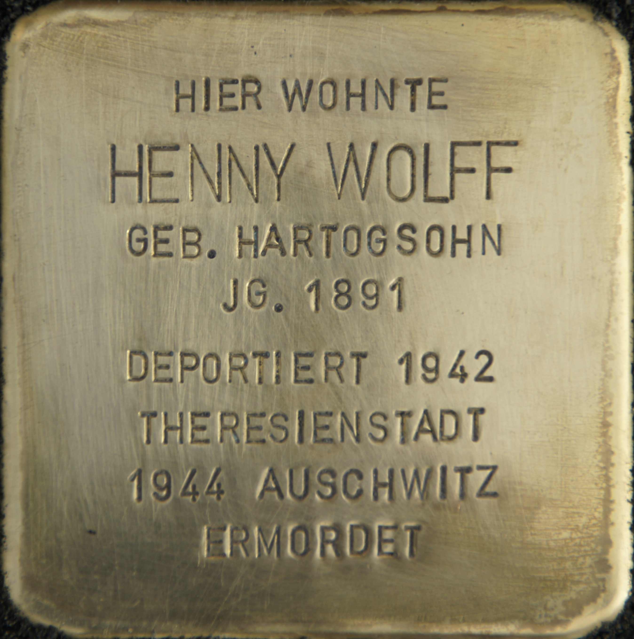 | Henny Wolff wird am 29. August 1891 in Emden geboren. Sie ist die Tochter von Asher Elias Hartogsohn und dessen Frau Sara, geb. Hartogsohn. Am 19. Februar 1920 heiratet Henny in Emden den Schlachter und Viehhändler Daniel Samuel Wolff aus Aurich. Das junge Paar lässt sich in Aurich nieder, wo Daniel, dessen Vater Samuel und mehrere Brüder von Daniel als Schlachter und Viehhändler tätig sind. Henny und Daniel leben in Aurich zunächst in der Fockenbollwerkstraße 12, später in der Fockenbollwerkstraße 16 zur Miete.