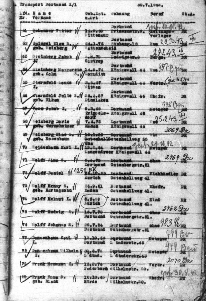 Rund ein Jahr nach der Eheschließung wird das erste Kind der beiden geboren: Am 5. Februar 1921 erblickt Tochter Caroline das Licht der Welt. Sie wird nach Daniels Mutter benannt. Senta Sara, die eineinhalb Jahre später geboren wird, bekommt als Zwischennamen den Namen von Hennys Mutter. Am 19. Februar 1924, dem Hochzeitstag von Henny und Daniel, wird dann Sohn Ernst geboren und das Nesthäkchen Helmut kommt schließlich fünfeinhalb Jahre später, am 8. Mai 1929 zur Welt. Die Geschäfte von Daniel scheinen in den zwanziger Jahren gut zu laufen, denn auf der Einwohnermeldekarte ist vermerkt, dass Henny im Haushalt von Hausmädchen und Dienstmädchen unterstützt wird. Mit dem Machtantritt der Nationalsozialisten muss sich diese gute Situation jedoch grundlegend geändert haben – nicht nur, dass die Familie wie die übrigen Mitglieder der jüdischen Gemeinde unter zahlreichen Repressalien und Schikanen zu leiden hatte: Die Schächtmesser der jüdischen Schlachter waren verbrannt worden, ab dem 1. Mai 1933 war das Schächten gesetzlich verboten. Die jüdischen Schlachter konnten ihren Beruf nun nicht mehr ausüben. Hennys Mann Daniel muss seinen Betrieb schließen, er ist später als Arbeiter tätig. Am 29. April 1936 zieht die Familie in das Haus in der Wallstraße 56 und mietet dort die obere Etage, insgesamt sieben Räume. Kurz nach dem Umzug verlassen die beiden Töchter den Haushalt endgültig: Caroline, die bereits ein Jahr in Wolfratshausen gearbeitet hatte, zieht nach Frankfurt, und Senta geht „in Stellung“ bei Familie Sternberg, später arbeitet sie als Hausmädchen bei Knurrs – beide Kaufmannsfamilien sind durch die Hochzeit von Lea Knurr und Erich Sternberg miteinander verwandt. Die Pogromnacht am 9. November 1938 war in mehrerer Hinsicht ein Schock für Henny: Nicht nur, dass in dieser Nacht die Auricher Synagoge niedergebrannt wird, ihr Mann Daniel wird verhaftet und einen Tag und zwei Nächte hindurch gefangen gehalten und gedemütigt. Da Daniel jedoch im Ersten Weltkrieg gekämpft hatte und mit dem „Eisernen Kreuz“ ausgezeichnet worden war, wird er am 11. November morgens wieder freigelassen. Henny und Daniel wird klar, dass sie, wie bereits mehrere Brüder von Daniel, Deutschland verlassen sollten. Zunächst schicken sie ihren vierzehnjährigen Sohn Ernst in die Niederlande, zu Daniels Bruder Hermann. Aus einem Brief von Henny, der erhalten geblieben ist, wird deutlich, dass Henny und Daniel verzweifelt versuchten, für Ernst einen Platz auf einem Lehrgut zu erhalten: Sie wollten, dass ihr Sohn auf eine Auswanderung nach Palästina vorbereitet wird. Senta, Hennys jüngere Tochter, hatte einen solchen Platz auf dem Gut Gehringshof bei Fulda bereits gefunden. Auch Henny und Daniel haben vor, mit ihrem jüngsten Kind Helmut zumindest in die Niederlande auszuwandern. Der Ausbruch des Zweiten Weltkrieges macht jedoch alle Pläne zunichte. Zu Beginn des Jahres 1940 erhalten Henny und ihr Mann die Aufforderung, Ostfriesland innerhalb der nächsten sechs Wochen, bis zum 1. April des Jahres, zu verlassen. Da sie nicht wissen, wo sie unterkommen werden – es war zu dieser Zeit sehr schwer für Juden, Wohnungen zu mieten – wird der elfjährige Helmut allein nach Köln geschickt, vermutlich in ein jüdisches Kinderheim. Die jüdische Gemeinde hatte diese Möglichkeit organisiert, um zumindest die Kinder ordentlich unterzubringen. Für Henny muss es sehr schwer gewesen sein, sich nun auch von ihrem jüngsten Kind auf unbestimmte Zeit zu verabschieden. In Dortmund sind Henny und Daniel zunächst in der Märkischen Straße 70 gemeldet, später wohnen sie im Ostenhellweg 41, hier ist schließlich auch Helmut gemeldet. Auch Tochter Senta kehrt zur Familie zurück, sie wohnt aber sehr wahrscheinlich nicht mit den Eltern zusammen in Dortmund. Am 30. April 1942 muss Henny sich von ihrer Tochter Senta verabschieden: Diese wird von Dortmund aus nach Zamosc bei Lublin deportiert, wo sich ihre Spur verliert. Henny, Daniel und Helmut werden drei Monate später ebenfalls deportiert: Sie werden zunächst nach Theresienstadt gebracht, wo sie Ernst wiedertreffen. Ernst war mit der Familie seines Onkels Hermann nach der deutschen Besetzung von Holland verhaftet und schließlich über das Lager Westerbork deportiert worden. Am 28. September 1944 muss sich Henny von ihrem Mann trennen – sie sollte ihn nie wiedersehen. Daniel wird von Theresienstadt nach Auschwitz deportiert und dort vermutlich direkt nach seiner Ankunft ermordet. Henny und ihr Sohn Helmut werden nur acht Tage später, am 6. Oktober 1944, ebenfalls nach Auschwitz deportiert. Von beiden fehlt seither jede Spur, auch sie wurden sicher kurz nach ihrer Ankunft getötet. Henny Wolff wurde 53 Jahre alt. |