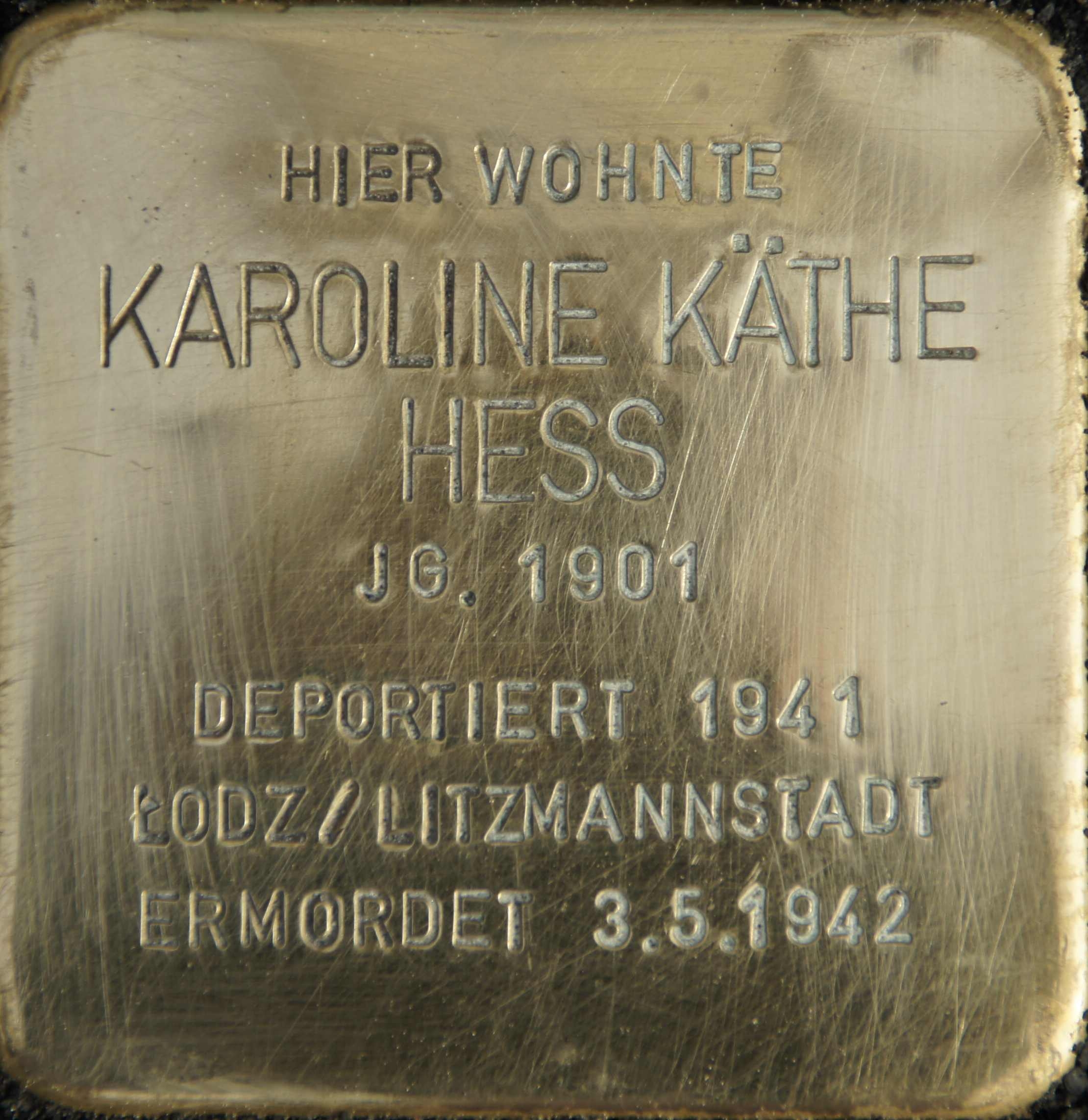 | Karoline Hess wird am 20. Juni 1901 in Dornum geboren. Sie ist die Tochter des Schlachters und Viehhändlers Moses Hess und dessen Frau Bertha, geborene Wolffs. Die Familie ist sehr groß und hat insgesamt dreizehn Kinder, Karoline hat zehn ältere und zwei jüngere Geschwister. Die Familie lebt in Dornum in der Bahnhofsstraße 150, dort betreibt der Vater auch seine Viehhandlung mit angeschlossener Schlachterei. Die Familie ist in Dornum gut integriert, ihr Vater ist u.a. Mitglied im Schützenverein – und war sogar 1920 Dornumer Schützenkönig.Karoline hat eine leichte geistige Behinderung und heiratet nicht. Sie arbeitet als Hausmädchen und zieht daher am 7. Juli 1936 nach Aurich. Ihre erste Station ist das Haus in der Wallstraße 56, hier wohnt sie für etwas über ein Jahr, bis zum 1. Dezember 1937, bei ihrer Cousine Bertha Gottheim/Wolff. Es folgt eine Anstellung bei Familie Wolff im Breiten Weg 8, die mit den hier im Haus wohnenden Wolffs verwandt sind, und ab dem 1. April 1938 wohnt Karoline, die meist Käthe genannt wird, in der Marktstraße 2. Im November 1939 wohnt sie schließlich wieder in der Wallstraße, dieses Mal im Haus Nr. 14.