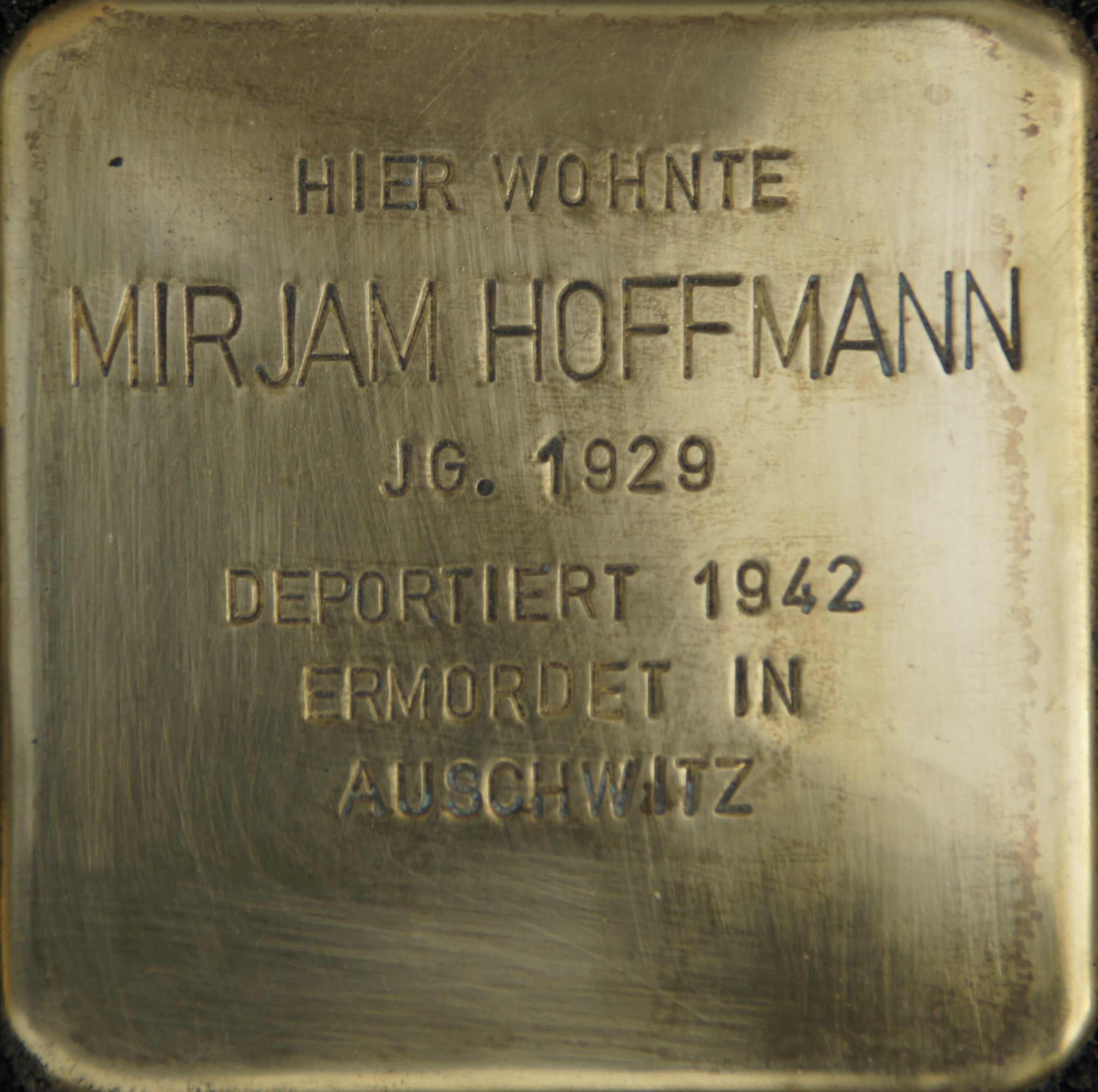 Mirjams Vater Friedrich ist Viehhändler, er hat sich wie ein Vater auf den Pferdehandel spezialisiert, und bis zum Machtantritt der Nationalsozialisten laufen die Geschäfte gut, sodass Mirjams Mutter im Haushalt bis 1936 durchweg von Dienstmädchen unterstützt wird. Schon bald nach 1933 muss Mirjams Vater jedoch den Viehhandel aufgeben und die Situation für die Familie ändert sich nicht nur finanziell zum Schlechteren. Wie die übrigen Mitglieder der jüdischen Gemeinde haben die Hoffmanns unter Schikanen und Repressalien zu leiden. Friedrich Hoffmann tut sein Bestes, um die Familie zu ernähren, er ist zunächst als Kohlenhändler und schließlich als Arbeiter tätig. Als alle Auricher Juden Anfang 1940 aufgefordert werden, Ostfriesland zu verlassen, verkaufen Mirjams Eltern das Haus und beschließen, nach Berlin zu gehen. Allerdings wissen sie wie viele andere Familien nicht, ob sie schnell bzw. überhaupt eine Wohnung finden würden. Die jüdische Gemeinde in Aurich hatte daher gemeinsam mit anderen ostfriesischen und der Hildesheimer jüdischen Gemeinde eine Notlösung organisiert, um zumindest die Kinder der Vertriebenen sicher unterzubringen: In Hildesheim gab es eine jüdische Volksschule, die nun zu einem Kinderheim umfunktioniert wird. Am 20. Februar 1940 muss sich Mirjam von ihrem großen Bruder verabschieden – dieser wird von den Eltern nach Steckelsdorf, auf ein Ausbildungsgut, geschickt, wo er auf eine Auswanderung nach Palästina vorbereitet werden soll. Zwei Tage später verlässt Mirjam selbst ihre Eltern und Ostfriesland und zieht nach Hildesheim um, sehr wahrscheinlich in das Kinderheim. Der Elfjährigen ist es sicher nicht leicht gefallen, sich auf unbestimmte Zeit von ihrer Familie zu trennen. Eine Aufnahme aus dem jüdischen Kinderheim „Am Lappenberg“ zeigt ein etwas schüchtern schauendes, aber breit lächelndes Mädchen, das mit großer Wahrscheinlichkeit als Mirjam Hoffmann identifiziert werden kann (2. v. l. stehend in der 1. Reihe, Foto ca. September 1940). Die Mitarbeiter im Heim haben sicher alles getan, um den Kindern den Aufenthalt so angenehm wie irgend möglich zu machen. Es ist unklar, wann Mirjam zu ihren Eltern zurückkehren konnte, doch lebt sie spätestens ab März 1942 (als das jüdische Kinderheim von den Nationalsozialisten geschlossen wirde) wieder in Berlin, in der Weinmeisterstraße Nr. 10, zusammen mit ihren Eltern und ihrem Bruder. Am 9. Dezember 1942 müssen sich alle vier am Bahnhof Berlin-Moabit einfinden, einem Güterbahnhof. Von dort aus wird die Familie gemeinsam mit 996 anderen Menschen direkt nach Auschwitz deportiert. Der Zug kommt einen Tag später, am 10. Dezember, im Vernichtungslager an. Über Mirjams weiteres Schicksal ist nichts bekannt – sicher wurde sie bereits am Tag der Ankunft in Auschwitz ermordet. Mirjam wurde 13 Jahre alt. |