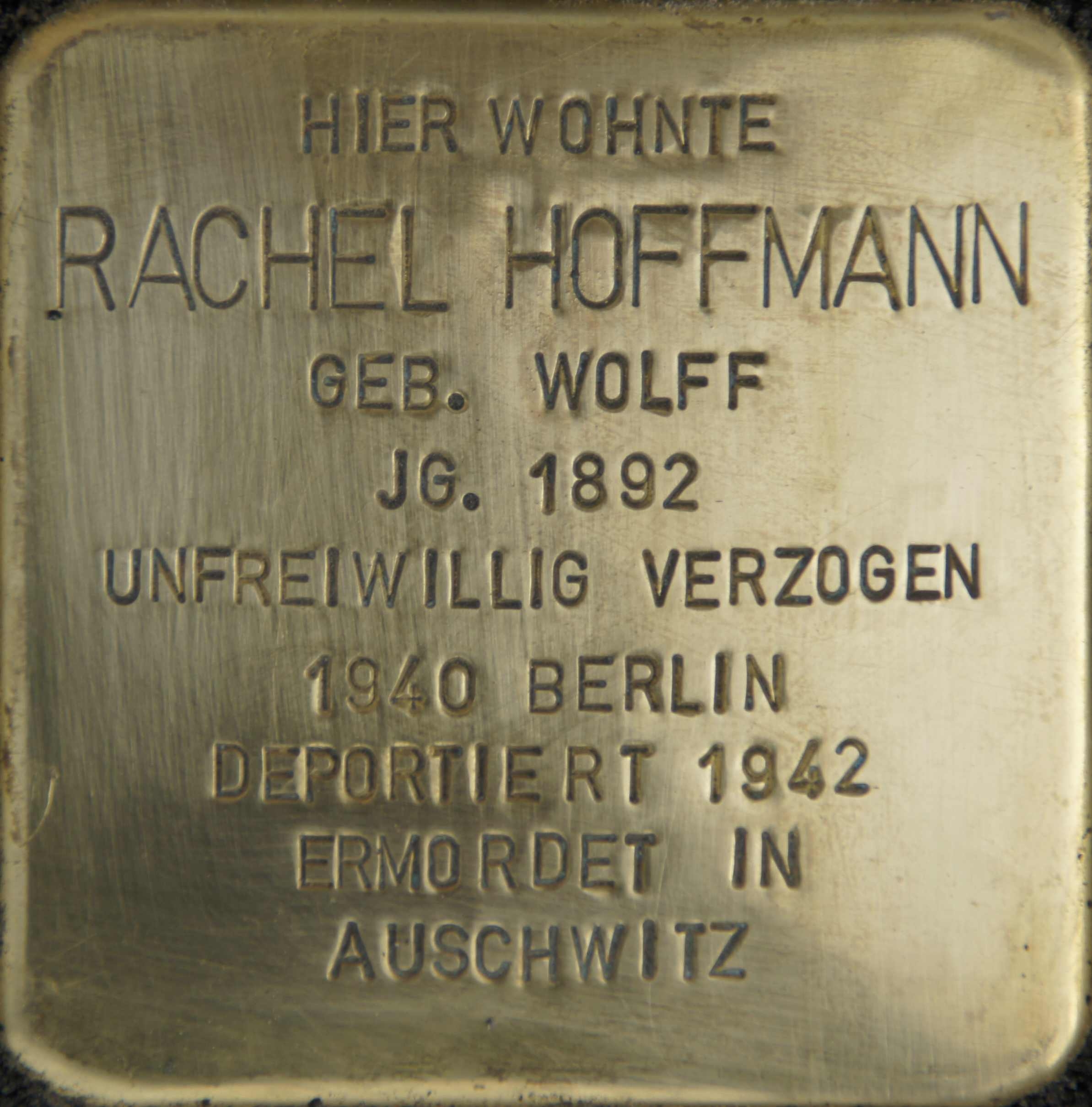 Rahel Hoffmann wird am 19. August 1892 in Aurich geboren. (Auf dem Gedenkstein steht der Name „Rachel“, da ihr Name entsprechend im jüdischen Geburtenregister geschrieben steht. In späteren Verzeichnissen wird sie ohne „c“ geschrieben, so auch als Mutter im jüdischen Geburtenregister.) Sie ist die Tochter des Viehhändlers David Levy Wolff und dessen Frau Marianne, geb. van Oss. Die Familie ist sehr kinderreich: Rahel hat vierzehn Geschwister, allerdings versterben fünf von ihnen bereits im Kleinkindalter.Am 10. Mai 1925 heiratet Rahel Friedrich Hoffmann, dessen Vater Meyer auch im Viehhandel tätig ist. Friedrich und Meyer Hoffmann haben sich jedoch auf den Pferdehandel spezialisiert.Das junge Paar zieht zunächst in die Leerer Landstr. Nr. 40 und bald darauf in die Norderstr. 11.Am 26. März 1926 bekommt Rachel ihr erstes Kind: Sohn Menno wird geboren. Rund eineinhalb Jahre später, am 15. Oktober 1927, kommt Töchterchen Jutta auf die Welt. Die junge Familie zieht nun in die Ukenastraße 2 in Aurich, das Haus gehört der Familie von Rahels Mann Friedrich. Finanziell geht es der Familie recht gut und Rahel wird im Haushalt von Dienstmädchen unterstützt.Das Jahr 1929 muss für Rahel ein Wechselbad der Gefühle gewesen sein: Ihre Tochter Jutta verstirbt am 13. Februar in Münster – zu diesem Zeitpunkt ist Rahel zugleich mit ihrem dritten Kind schwanger. Am 23. September wird Tochter Mirjam geboren. Kurz nach dem Tod von Jutta war die kleine Familie erneut umgezogen. Rahel, ihr Mann und ihr Sohn Menno zogen am 4. März 1929 in Rachels Elternhaus in der Wallstraße 16. Die ursprünglich gute wirtschaftliche Lage der Familie muss sich nach dem Machtantritt der Nationalsozialisten rasch eingetrübt haben. Rahels Mann Friedrich muss den Viehhandel aufgeben, er ist nacheinander zunächst als Kohlenhändler und letztlich als Arbeiter tätig. Dennoch gelingt es der Familie, das Haus zu halten. Erst als Rahel und ihr Mann wie alle übrigen Mitglieder der jüdischen Gemeinde die Aufforderung erhalten, Aurich bis zum 1. April 1940 zu verlassen, verkauft ihr Mann das Haus.Rahel und Friedrich ziehen nach Berlin, dort leben bereits zwei Schwestern von Rachel. Wie viele aus Ostfriesland vertriebene Juden hofft sicher auch Rachel auf eine zumindest etwas bessere Situation in einer größeren jüdischen Gemeinde in einer Großstadt. Langfristig scheinen Rahel und ihr Mann aber zumindest für ihre Kinder keine Zukunft in Deutschland gesehen zu haben, denn sie melden Menno zur Ausbildung auf dem jüdischen Umschulungsgut „Landwerk“ in Steckelsdorf an. Menno soll dort auf eine Auswanderung nach Palästina vorbereitet werden. Auch von ihrer Tochter Mirjam muss sich Rahel beim Wegzug aus Aurich zumindest vorübergehend verabschieden. Auf der Einwohnermeldekarte ist vermerkt, die elfjährige Mirjam sei allein nach Hildesheim verzogen: Vermutlich lebt Mirjam dort im Kinderheim „Am Lappenberg“. Dort werden viele Kinder aus Ostfriesland zunächst untergebracht, bis ihre Eltern eine neue Bleibe gefunden haben.Rahel und Friedrich finden in Berlin eine Unterkunft in der Weinmeisterstr. 10 und holen Mirjam schließlich wieder zu sich. Spätestens ab Ende Mai 1942 lebt auch Menno wieder bei seinen Eltern, denn die Nationalsozialisten schließen das Ausbildungsgut. Die Familie ist somit im Sommer 1942 wieder vereint. Am 9. Dezember 1942 müssen sich Rahel, ihr Mann Friedrich und ihre beiden Kinder am Bahnhof in Berlin-Moabit einfinden – einem Güterbahnhof. Sie werden von hier aus mit dem „Osttransport Nr. 24“ direkt nach Auschwitz deportiert. Der Zug kommt am 10. Dezember 1942 im Vernichtungslager Auschwitz an, Rahel und ihre Familie werden vermutlich noch am gleichen Tag ermordet. |