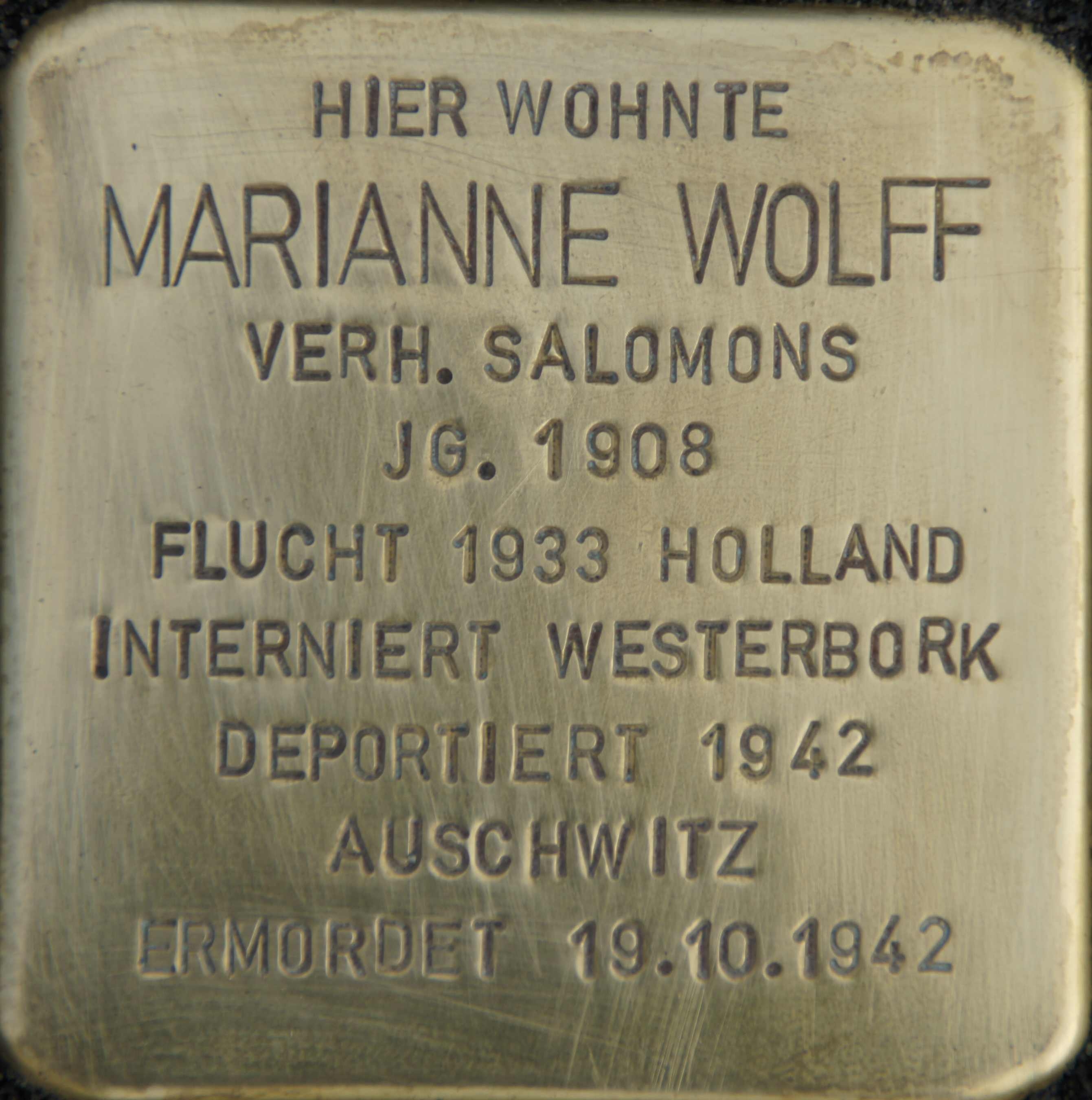 Nachdem deutsche Truppen die Niederlande überfallen und besetzt haben, beginnt auch hier die Judenverfolgung. Marianne Wolff und ihre Familie werden Anfang Oktober 1942 in Westerbork inhaftiert, am 16. Oktober 1942 nach Auschwitz deportiert und nach ihrer Ankunft ermordet. Mit demselben Transport werden auch ihr Vater und ihre Schwester Netta mit ihrer Familien nach Auschwitz deportiert. Marianne und ihr 4 Jahre alter Sohn Menno werden ebenso wie ihre Schwester Netta mit ihren Kindern Salomon (2 Jahre) und Levi (8 Monate) nach ihrer Ankunft ermordet. Als Todesdatum wird für Samuel Salomons und für Emanuel Izaaks der 31.03.1944 angegeben, ein Todesort ist nicht bekannt.
