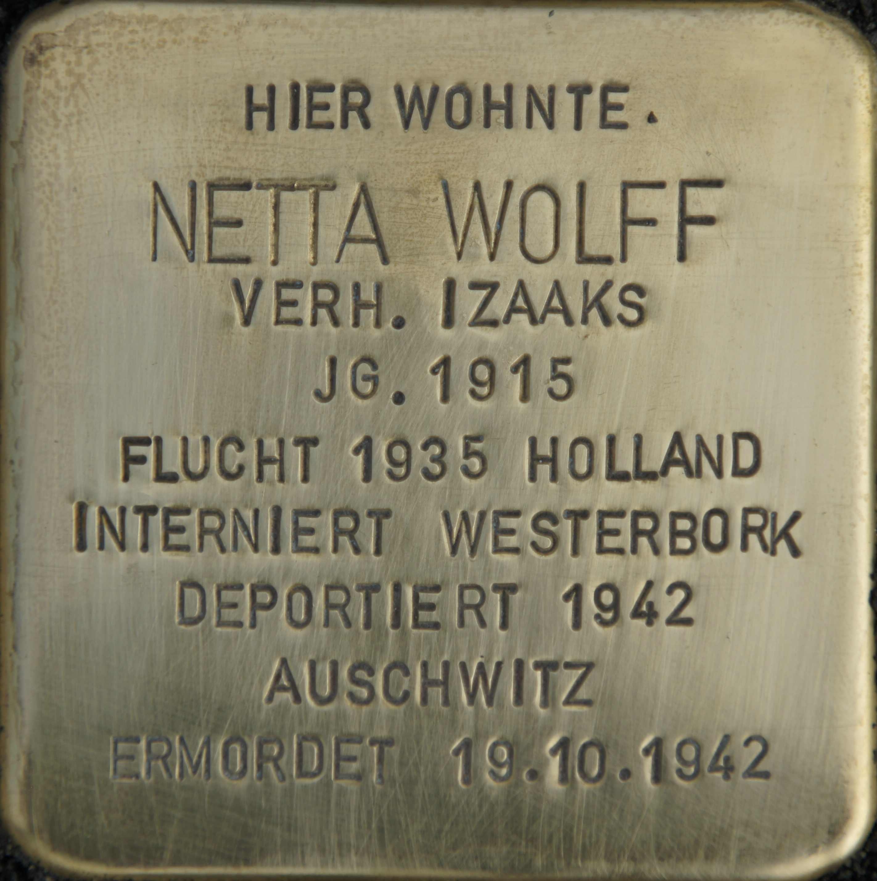 | In der Großen Mühlenwallstraße 1 wurden die Stolpersteine für Levy David Wolff und seine sechs Kinder – auch für die drei Überlebenden – als eine Art „Familienzusammenführung“ verlegt.Netta Wolff wurde am 2. März 1915 in Aurich als viertes Kind des Schlachters Levy David Wolff (1877-1942) und seiner Ehefrau Julia „Julchen“ Wolff geb. Salomons (1883-1926) aus Lage im Kreis Bentheim geboren.