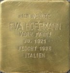 Eva Hoffmann kann wie alle jungen Juden in Aurich weder eine Schul- noch Berufsausbildung anfangen. Sie geht als Hausmädchen am 3. Juli 1937 nach Gießen und weiter am 23. Dezember nach Ludwigshafen. Am 17. Mai 1938 geht sie nach Palermo auf Sizilien. Die Familie Hoffmann hat verwandtschaftliche Beziehungen nach Italien, ihr Großvater stammt aus Triest. Eva schreibt ihrer Schwester Leni jedoch mehrmals und berichtet von ihrem Familienleben, ihren Kindern, Mirella *5. 10. 1939 und Frederico [sic!]. Nach dem Krieg besucht sie ihre Schwester in Israel. Aus der Zeit danach gibt es keine weiteren Zeugnisse. Von den anderen nach Palästina emigrierten Aurichern hat keiner mehr Kontakt zu ihr bekommen. Sie stirbt 2009.