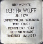 Bertha Wolff wird am 16.01.1878 in Aurich geboren. Ihre Eltern sind der Schlachter Levy Abraham Wolff (1843-1901) und Rebecca Isaac Wolff geb. Valk (1848-1921). Levy und Rebecca Wolff haben fünf Kinder: Bertha (geboren am 16.01.1878), Isaak Levy (geboren am 24.09.1879), Abraham Levy (geboren 1882 und schon nach wenigen Monaten verstorben), Betty (geboren am 17.06.1884) und Minna (geboren 1886, verstorben 1935). Minna blieb ledig und wohnte bis zu ihrem Tod bei ihren Geschwistern in der Markstraße 25.