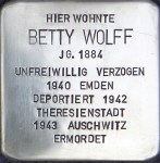 Betty Wolff wird am 17.06.1884 in Aurich geboren. Ihre Eltern sind der Schlachter Levy Abraham Wolff (1843-1901) und Rebecca Isaac Wolff geb. Valk (1848-1921). Levy und Rebecca Wolff haben fünf Kinder: Bertha (geboren am 16.01.1878), Isaak Levy (geboren am 24.09.1879), Abraham Levy (geboren 1882 und schon nach wenigen Monaten verstorben), Betty (geboren am 17.06.1884) und Minna (geboren 1886, verstorben 1935). Minna blieb ledig und wohnte bis zu ihrem Tod bei ihren Geschwistern in der Markstraße 25.