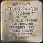 Hedwig Samson geb. Goldschmidt wird am 14.08.1880 in Aurich als jüngstes Kind der Eltern Marcus Goldschmidt (1841 – 23.09.1909) und Röschen Jacob Pels (1841 -18.01.1923) geboren. Sie wohnt in Aurich Sandhorst, Gut Coldehörn. Vier Geschwister werden zuvor geboren, eins stirbt aber mit zwei Jahren. Ihr Bruder Sally Goldschmidt wohnt mit Familie in der Osterstraße.Hedwig Goldschmidt heiratet den Viehhändler Abraham Samson in Aurich.Das Paar bekommt zwei Kinder: Julius 1907 und Emmy 1908. Ihr Sohn Julius geht Ostern 1917 auf das Ulricianum. 1926 kauft ihr Mann Abraham Samson das Gut Coldehörn, welches von weiträumigen Ländereien nördlich von der Straße Am Tiergarten bis zur Alten Ehe im Westen, umgeben ist. 1938 geht ihre Tochter Emmy nach Dortmund und heiratet einen Siegfried Stern. Die Lebensbedingungen werden für die Samsons in Aurich wegen des Berufsverbots immer schwieriger. Die Eltern Samson ziehen noch vor dem zwangsweisen Wegzug aller Juden im Februar 1940 schon Ende 1939 nach Dortmund. Das Ehepaar Samson wohnt in Dortmund in der Saarlandsraße 71, ein Judenhaus in der damaligen Zeit.Am 29.07.1942 wird sie mit ihrem Ehemann und dessen anderen Brüdern Ruben, Herz und Bendit mit Transport X1 ab Dortmund nach Theresienstadt deportiert.Von Theresienstadt wird sie am 26.10.1944 nach Auschwitz deportiert. Da die alten Samsons weit über der Altersgrenze der Nutzbarmachung aus Vernichtung durch Arbeit waren, werden sie unmittelbar bei Ankunft in die Gaskammer getrieben. |