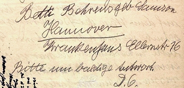 „Sehr geehrte Frau Oberin [Helmers] – ich liege hier im Krankenhaus doch bin ich auf dem Wege der Besserung daher schreibe ich mit Bleistift was Sie bitte Entschuldigen. Ich war schon einmal dort. Wie Sie vielleicht wissen, mußten wir Juden Aurich verlassen. Mein liebe Mutter ist in Hamburg Altersheim mein Bruder mit Frau sind im Ausland, ich bin hier in Hannover verheiratet. Nun möchte ich Sie geehrte Frau Oberin bitten es gehen so allerhand Gerüchte herum ist meine Schwester Resi Samson noch dort und wie geht es Resi falls Sie nicht mehr dort sein sollte bitte ich auch um Auskunft, Rückporto liegt bei“