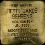| Betti Jakob Behrens geb. Samson wird am 28. 11. 1908 in Aurich geboren. Ihre Eltern sind Jakob Hartog Samson und Jenny Salomon „Minna“ Samson geb. Windmüller. Sie hat eine ältere Schwester Resi und einen jüngeren Bruder Hugo. Ihr Vater Jakob betreibt mit seinem Bruder Simon Hartog eine Schlachterei in der Marktstraße 19. In den Sommerferien arbeitet ihr Vater in der koscheren Fleischversorgung auf Norderney in der Winterstraße 5. Er stirbt 1934.