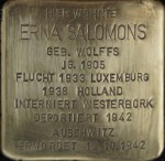 Am 08.05.1936 heiratet sie den Viehhändler Isaak Salomons. Dessen erste Ehefrau, die er am 30.10.1931 geheiratet hatte, verstarb am 25.04.1933. Isaak Salomos wurde am 24.12.1901 in Vlagtwedde (Provinz Groningen/NL) geboren. Bis zum 22.02.1918 ist er in Schüttorf, Kr. Bentheim gemeldet (ab wann ist nicht bekannt). Seit dem 10.10.1925 ist er in Aurich gemeldet mit verschiedenen Wohnadressen. Nach der Hochzeit ziehen Isaak und Erna Wolffs am 19.05.1936 nach Aurich in die Wallstraße 14. Am 21.06.1937 wird ihre Tochter Thea Salomons geboren, mit der Erna ein Jahr später, am 9.05.1938, nach Groningen emigriert. Ihr Mann Isaak ist schon am 19.04.1938 in Aurich abgemeldet Zwischen dem 3. und 5.10.1942 werden sie inhaftiert und in das Lager Westerbork gebracht, von wo sie am 9.10.1942 nach Auschwitz deportiert werden. Erna Salomons und ihre Tochter Thea werden am 12.10.1942 ermordet, ihr Mann Isaak am 3.01.1943. |