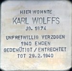 Benjamin Bendix Wolffs (*4.05.1871) – Deportation nach Auschwitz am 28.10.1944 (s. Biografie auf dieser HP). Jehuda Julius Wolffs (*30.04.1972 +16.12.1915) Moses Wolff Wolffs (*30.06.1873) – Deportation nach Auschwitz am 28.10.1944 (s. Biografie auf dieser HP). Goldine Wolffs verh. Cohen (*9.02.1876) – Verzieht nach Emden (dort Stolperstein). Deportation 2.04.1942 mit ihrem Ehemann Abraham Cohen in das Ghetto Warschau. Todesdatum unbekannt. Rosa Wolffs (*5.05.1878 +16.02.1879) Rosa Wolffs (*4.10.1879) – Deportation von Berlin nach Lodz/Litzmannstadt am 24.10.1941, ermordet in Kulmhof/Chelmno. Todesdatum unbekannt (s. Biografie auf dieser HP). Zerline (*29.03. 1883 +16.05.1883) Heimann (*2.06.1884) – Er verstirbt nach schweren Misshandlungen im KZ Sachsenhausen am 22.12.1938 in Aurich (s. Biografie auf dieser HP). Eva verh. Wolff (*23.04.1887) – Sie ist verheiratet mit Moritz Meir Wolff (1876-1955) aus Norden und zieht nach der Hochzeit dorthin. Die Eheleute haben 4 Kinder (Ernst *1912 Norden +2002 Sydney/Australien, Greta *8.06.1914 Norden +1945 Melbourne, Werner Benjamin *2.06.1917 Norden +8.04.1989 London/GB, Julius *1922 Norden – als Kind verstorben?). Sie können am 27.03.1939 nach London,England fliehen. Eva verstirbt in London am 20.10.1947. Sie überlebt als einzige der Geschwister den Holocaust. Karl ist in erster Ehe mit Sara Feibelmann Hoffmann (*13.12.1870 in Aurich) verheiratet. Saras Mutter ist Rösjen Selig Wolff (1842-1915) und ihr Vater der Händler Feibelmann Meyer Hoffmann (1834-1910). Sie hat noch einen Bruder Jacob Feibelmann, der jedoch am 31. Oktober 1918 verstorben ist. Die Ehe von Sara und Karl bleibt anscheinend kinderlos. Sara Feibelmann stirbt am 14.01.1925 an „Lungenschlag“, also einer Lungenembolie. Karl heiratet noch im selben Jahr Henriette „Jettchen“ Rosenthal. Henriette Rosenthal wird am 10. Juni 1888 in Vreden Krs. Ahaus geboren. Sie ist die Schwester von Siegfried Rosenthal (*15.02.1887 in Vreden, wohnhaft in Köln, inhaftiert im KZ Dachau 16.-26.11.1938, deportiert am 22.10.1941 nach Litzmannstadt/Lodz, 1944 ermordet in Kulmhof/Chelmno) und eine Schwägerin von dessen Ehefrau Emma Rosenthal geb. Levy (*25.12.1890 in Remagen, deportiert am 22.10.1941 nach Litzmannstadt/Lodz, dort am 25.02.1943 im Ghetto verstorben). Vom 2.11.1926 an lebt sie mit Karl in der Wallstraße 2. Am 20.05.1938 ziehen Karl und Henriette in die Lilienstraße 12, zu diesem Zeitpunkt eine Art „Judenhaus“, d. h. Sammelunterkunft. Eine Internierung von Karl Wolffs im KZ Sachsenhausen nach der Reichspogromnacht (9.11.1938) ist aufgrund seines Alters unwahrscheinlich und nicht belegt. Am 29.02.1940 zieht er mit seiner Frau Henriette „Jettchen“ in das jüdische Altersheim in Emden in der Schoonhovenstr. 13/14. Dort stirbt er am 12.10.1940. Seine Frau Henriette geht am 28.03.1941 nicht zu ihrer Schwägerin Emma Rosenthal geb. Levy nach Köln, sondern deren Bruder, Jonas Levy (*4.06.1883), nach Remagen. Sie lebt zusammen mit dessen Familie in dem Hinterhaus der jüdischen Familie Fassbender in der Bachstraße 19. Sie wird, ebenso wie Jonas Levy, der Schwager ihres Bruders, und dessen Frau Sophia zunächst am 26.04.1942 von Remagen in das Sammellager Brohl transportiert und am 30.04.1942 mit 770 Deportierten von Koblenz in das Ghetto Krasniczyn, Bez. Lublin, deportiert und vermutlich on Sobibor ermordet. Sie finden sich auf einer Liste des Landrates des Landkreises Ahrweiler mit den Namen von 21 jüdischen Bewohnern der Städte Remagen und Sinzig, die am 26.4.1942 „unbekannt wohin verzogen“ bzw. „ausgewandert“ sind. Das Ghetto Litzmannstadt/Lodz ist ein Durchgangslager für die Vernichtungslager Sobibor, Belzec, Treblinka und Auschwitz. Das Ghetto wird am 6.06.1942 geschlossen und die Überlebenden nach Sobibor gebracht und dort ermordet. Für Henriette Wolffs geb. Rosenthal wurde am 19.04.2012 ein Stolperstein in Remagen in der Bachstraße 19 verlegt. Für Henriette Wolffs geb. Rosenthal ist auch ein Stolperstein in Remagen verlegt. |