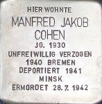 | Manfred wird am 14.03.1930 in Aurich geboren. Er ist das dritte Kind der Eltern Jakob Moses Cohen und Hannchen geb. Wolff und hat drei weitere Geschwister: David, Minka (Mia) und Martha. Zwei weitere werden noch geboren, ein Junge vor ihm. Er stirbt am Tag der Geburt, Zilla stirbt 1939 nach 12 Tagen.
