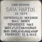 Sara Hartog war schon Rentnerin, als sie von den Nationalsozialisten deportiert wurde. Sie kam über Hamburg in das Ghetto Litzmannstadt und von da wie ihre Schwester Bertha in das Vernichtungslager Kulmhof (Chelmno). Dazu gibt es ein grausiges Dokument: der sogenannte „Älteste der Juden“ in Litzmannstadt bescheinigt die Abmeldung der Sara Hartog mit dem Hinweis, sie sei „ausgewiesen“ worden. Das war eine Umschreibung für die Reise in den Tod, in das Vernichtungslager. In Chemno wurden die Ankommenden mit Auspuffgasen in LKWs auf grausame Weise ermordet.