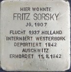 | Fritz Sorsky wird am 17. November 1907 in Bittkow, Kreis Kattowitz in Schlesien geboren wurde. Fritz Sorsky ist Manufaktorist und kommt im Jahr 1926 nach Deutschland, er erhält eine Einbürgerungsurkunde, die ihm die preußische Staatsangehörigkeit bescheinigt. Im Oktober 1926 bezieht er eine Wohnung in Aurich in der Kirchstraße 7 als Mieter bei Familie van Dyk. Er heiratet Edith Wolffs, 4. Von 6 Kindern von Meyer Zwi Wolffs und Helene Wolffs geb. Cohen. Auf das Schicksal von Fritz Sorsky wird weiter unten eingegangen.