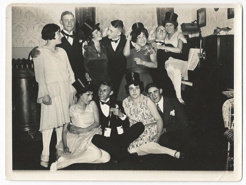 von links Dina Buxbaum, Julius Samson, Emmi Samson = Julius‘ Schwester, Harri Hoffmann, dann Martha Moses des Lehrers Moses‘ Tochter und Hanna Sondhelms Mutter, Manfred Hoffman in den Armen von Herta Goldschmidt = zukünftige Frau von Harri. und vorne sind Mary Gidansky und Henry Lachmann.