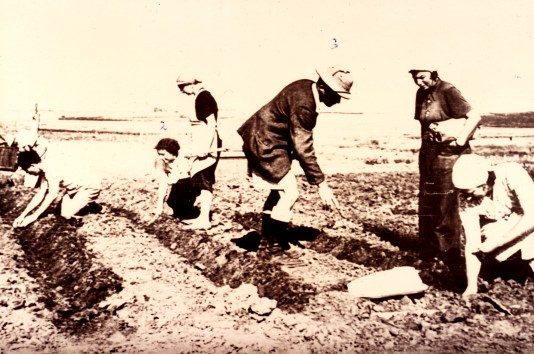 Ende der 30er Jahre war der Moshav Bet Jizchak gerade neu gegründet worden. Besonders viele deutschsprachige Auswanderer ließen sich dort nieder. (Noch heute sind einige alte Hinweistafeln aus der Gründerzeit deutschsprachig dort zu finden.) Die Probleme bei der Gründung einer solchen landwirtschaftlichen Siedlung waren viel¬schichtig: Das Gelände war vorher nicht landwirtschaftlich genutzt und musste erst mühsam hergerichtet werden. Zum anderen waren diejenigen, die sich nun nach ihrer Vertreibung solchen Aufgaben gegenüber sahen, hierfür überhaupt nicht vorgebildet. Deshalb konnte 1941 das Foto entstehen, das einen britischen Instrukteur zeigt, der die jüdischen Neueinwanderer darin unterweist, wie Gurkensamen fachgerecht auszubringen waren.