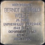 | Berndt Leopold Wolff wird am 24.01.1930 als zweites Kind des Kaufmanns Wilhelm Moses Wolff und seiner Frau Erna geb. Wallheimer in Aurich geboren. Seine Eltern geben ihm den Zwischennamen Leopold in Gedenken an Wilhelms Bruder, der 1916 im Ersten Weltkrieg fiel.