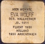 Die Großeltern sind Benjamin Baruch Levy Wallheimer, geboren am 08. Juni 1856 in Aurich und Eva Maria Wallheimer, geborene Herzberg, geboren am 19. Dezember in Aurich, väterlicherseits. Die Großeltern mütterlicherseits sind Markus Mordechai Herzberg, geboren 1822, und Rebekka Herzberg, geborene Mannheim, geboren 1825. Eva Wallheimer hat zwei Brüder. Benjamin Levy Wallheimer ist am 06. Mai 1912 in Aurich geboren und Josef Wallheimer ist am 12. Juni 1915 in Aurich geboren. Eva Wallheimer wohnt mit ihren Eltern Levy Benjamin und Regine Reichel und ihren Brüdern Benjamin Levy und Josef zunächst in der Norderstraße 19, dann nach dem Tod der Mutter Regine Reichel am 07. September 1931, ab dem 01.April 1932 im Haus der Großeltern Benjamin Baruch und Eva Maria Wallheimer, Breiter Weg 1. Ab dem 10. September 1935 wohnt Eva Wallheimer mit dem Vater Levy Benjamin und den Brüdern Benjamin Levy und Josef im Haus der Witwe Henriette Wolff in der Wallstraße 56, heute Wallstraße 54. Am 12. Mai 1933 heiratet Eva Wallheimer in Aurich Siegfried Wolff, geboren am 29. Oktober 1908 in Aurich, den Sohn der Henriette Wolff. Das Paar hat zwei Söhne. Wilhelm ist am 28. Juli 1933 in Aurich geboren und Levy am 11. April 1936, ebenfalls in Aurich. Die Familie lebt im Haus der Mutter Henriette Wolff in der Wallstraße 56, heute Wallstraße 54. Am 20. August 1936 heiratet Eva Wallheimers Vater Levy Benjamin Wallheimer die Witwe und Geschäftsfrau Henriette Wolff, geborene Heß. Nicht ganz drei Monate zuvor, am 01. Juni 1936, verlassen Eva und Siegfried Wolff mit ihren Kindern Wilhelm und Levy Aurich und ziehen nach Amsterdam, in den Stadtteil Laandam (so die Eintragung im Melderegister), heute Zaandam , in die Niederlande. Nach nicht ganz zwei Jahren dort, verlässt die Familie die Niederlande und kommt am 04. April 1938 nach Argentinien, nach Buenos Aires. Dort arbeiten andere Familienangehörige, so berichtet Levy Wolff, als Schlachter und Kaufleute. Hier geht der Sohn Levy Wolff zunächst mit dem Großvater Levy Benjamin Wallheimer in die Barill-Siedlung und kehrt später im Alter von acht Jahren zur Familie nach Buenos Aires zurück. Im Jahr 1958 gründet Siegfried Wolff zusammen mit seinem Sohn Levy eine Importfirma und arbeiten mit Firmen in Asien. So hat die Familie immer ein gutes Auskommen. Das erzählt der heutige Firmeninhaber Levy. Eva Wolff, geborene Wallheimer, stirbt am 17. November 1995 in Buenos Aires. |