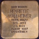 Die Großeltern sind Joseph Moses Heß und Jette Heß, geborene Weinthal, väterlicherseits. Die Großeltern mütterlicherseits sind Wolf Jacob Wolff, geboren am 26. Januar 1837 in Großefehn und Henriette Hindel Wolff, geborene Rose, geboren am 15. Oktober 1837. Henriette Heß hat zwölf Geschwister. Neun Geschwister sterben im Säuglings- und Kindesalter. Ihre Schwester Jettchen Jetty Heß, geboren um 09. November 1890 in Dornum, stirbt 1950 in Toledo (Ohio). Sie war mit Abraham Jakob Cohen (1871-1943, Stolperstein in der Marktstraße 16) verheiratet und hatte mit ihm sechs Kinder. Die Schwester Jeanette Schöntje Heß, geboren am 13. Dezember 1895 in Dornum, stirbt am 13. Dezember 1961 in Norden. Die Schwester Käthe Caroline Heß, geboren am 21. Juni 1901 in Dornum, wohnt später im Haus der Familie Wolff in der Wallstraße 56, stirbt am 03. Mai 1942 in Lodz (Ghetto). Für sie ist in der Wallstraße 56, heute 54, ein Stolperstein verlegt. Henriette Heß heiratet im Jahr 1908 in Dornum Wilhelm Samuel Wolff, geboren am 12. Mai 1881 in Aurich. Wilhelm Samuel Wolff ist von Beruf Schlachter. Das Ehepaar wohnt in der Wallstraße 56 in Aurich und hat zwei Kinder. Der Sohn Siegfried ist am 29. Oktober 1908 in Aurich geboren. Die Tochter Bertha ist am 02. April 1910 ebenfalls in Aurich geboren. Bertha Wolff heiratet später in Amsterdam Hans Gottheim. Sie überlebt mit ihrer Familie den Holocaust nicht. Ihr Sterbedatum und Sterbeort ist der 17. Juli 1942 in Auschwitz. Für sie ist der Stolperstein in der Wallstraße 56, heute 54, verlegt. Am 11. April 1924 stirbt der Ehemann Wilhelm Samuel Wolff an einer Lungenentzündung und wird auf dem Jüdischen Friedhof in Aurich beigesetzt. In der Wallstraße 56 wohnen in den Jahren danach die Witwe und Geschäftsfrau Henriette Wolff, der Sohn Siegfried und die Tochter Bertha. Am 12. Mai 1933 heiratet ihr Sohn Siegfried Wolff in Aurich Eva Wallheimer, geboren am 13. März 1911 in Aurich. Das Ehepaar bekommt zwei Kinder, den Sohn Wilhelm, geboren am 28. Juli 1933 und den Sohn Levy, geboren 11. April 1936 und wohnt im Elternhaus des Siegfried Wolff in der Wallstraße 56. Am 01. Juni 1936 verlässt das Ehepaar Siegfried und Eva Wolff mit ihren Kindern Wilhelm und Levy Aurich und zieht nach Amsterdam in die Niederlande und von dort nicht ganz zwei Jahre später nach Buenos Aires, Argentinien. Am 20. August 1936 heiratet Henriette Wolff, geborene Heß, in Aurich den Viehhändler Levy Benjamin Wallheimer, geboren am 20. November 1881 in Aurich. Im Haus der Henriette Wolff leben in dieser Zeit auch die Tochter Bertha Wollf, die Schwester Käthe Caroline Heß und die beiden Söhne des Levy Benjamin, Benjamin Levy und Josef Wallheimer. Am 19. November 1937 sind das Ehepaar Levy Benjamin und Henriette Wallheimer und der Sohn Benjamin (Benni) Levy abgemeldet aus Aurich nach Barill-Siedlung, Entre Rios, Buenos Aires, Argentinien. Der Sohn Josef Wallheimer ist bereits am 05. Januar 1937 dorthin abgemeldet. In Buenos Aires teilt sich die Familie, so ist es dem Bericht des Enkels Levy Wolff zu entnehmen. Einige Mitglieder der Familie Wallheimer und später auch der Familie Wolff bleiben in Buenos Aires und arbeiten als Schlachter und Kaufleute. Levy Benjamin Wallheimer, im Jahr 1938 kommt der Enkel Levy Wolff dazu, geht in die Barill-Siedlung und bearbeitet ein etwa 100 ha großes landwirtschaftliches Anwesen. Es gibt keinen Strom und keine Autos. Nach Buenos Aires sind es mit der Kutsche und der Eisenbahn zwei Tagesreisen. Da keine anders lautenden Berichte vorliegen, ist davon auszugehen, dass Henriette Wallheimer, verwitwete Wolff, geborene Heß, in Buenos Aires verbleibt. Henriette Wallheimer stirbt am 29. Juni 1956 in Buenos Aires. |