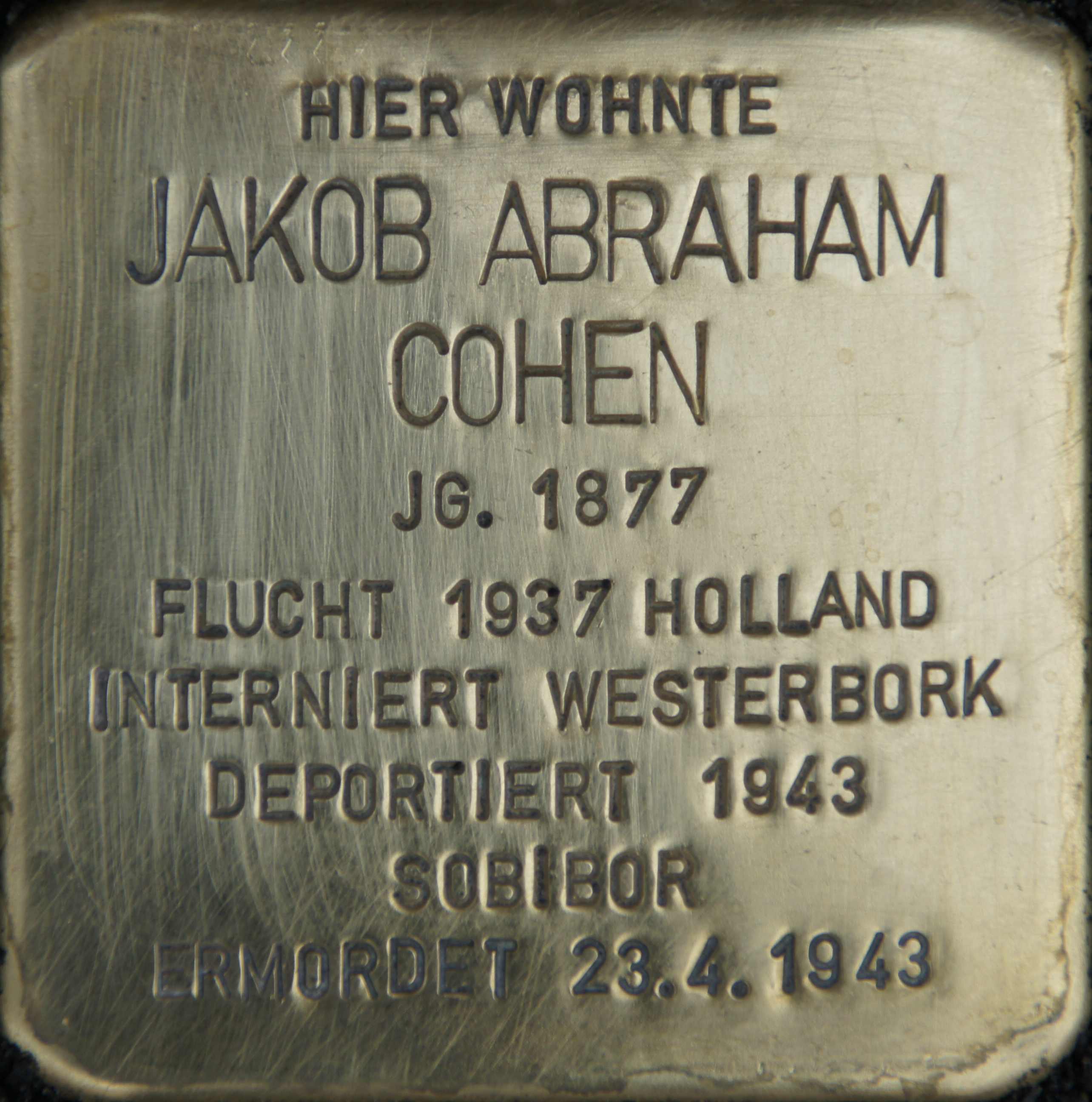 Als nach der Besetzung der Niederlande durch deutsche Truppen auch dort die Judenverfolgung einsetzt, werden Jakob Abraham Cohen und seine Frau Eva am 6. April 1943 in Westerbork interniert und am 20. April 1943 nach Sobibor deportiert. Vermutlich werden sie nach ihrer Ankunft ermordet. Ein genaues Todesdatum ist nicht bekannt.